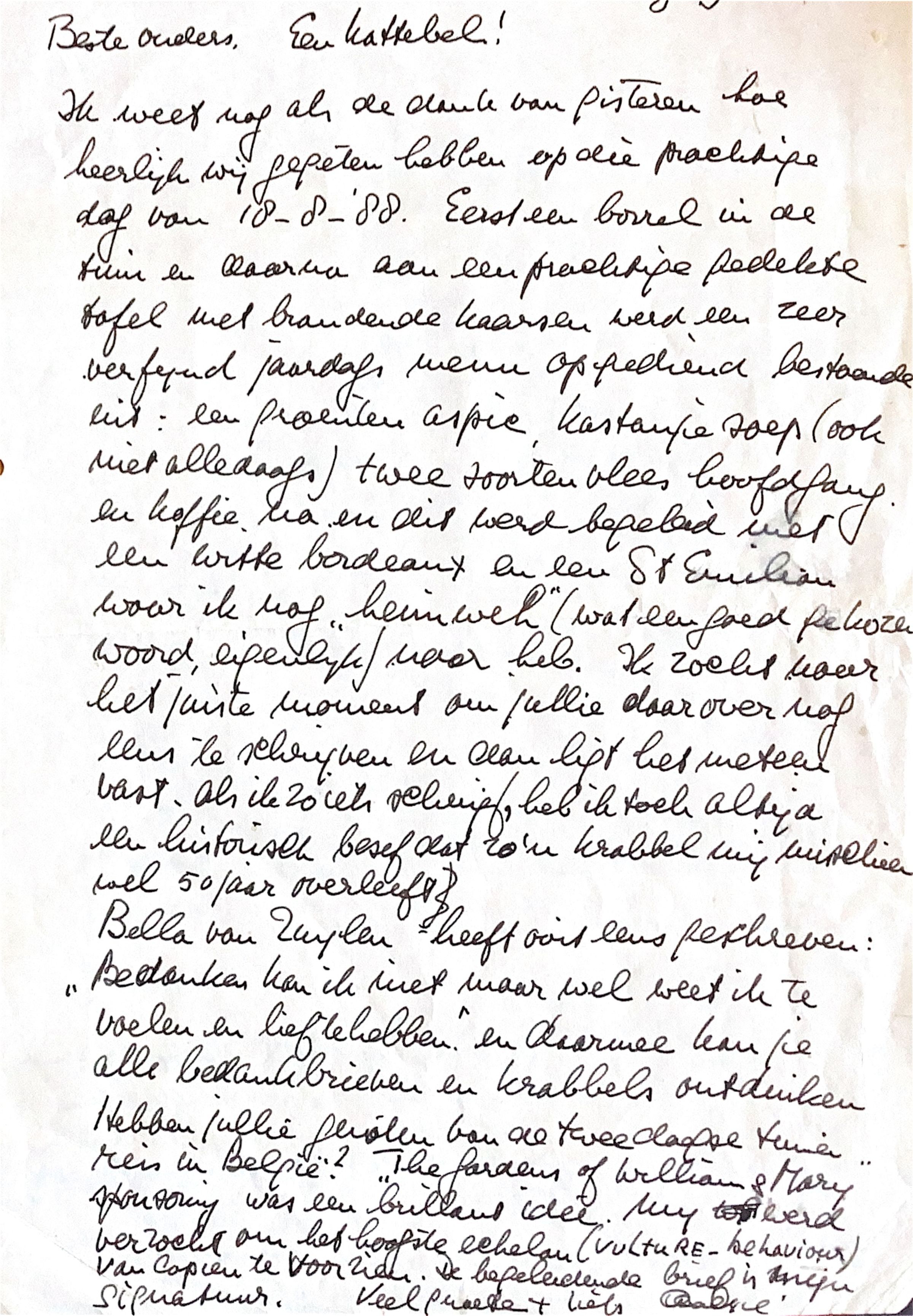 Ik weet nog als de dag van gisteren hoe heerlijk wij gegeten hebben op de prachtige dag van 18-08-1988. Eerst een borrel in de tuin en daarna aan een prachtige gedekte tafel met brandende kaarsen werd een zeer verfijnd verjaardagsmenu opgediend bestaande uit: een groenten-aspic, kastanjesoep (ook niet alledaags) twee soorten vlees bij de en koffie na hoofdgang met koffie daarna. Bij deze maaltijd werd een witte Bordeaux-wijn geserveerd en een