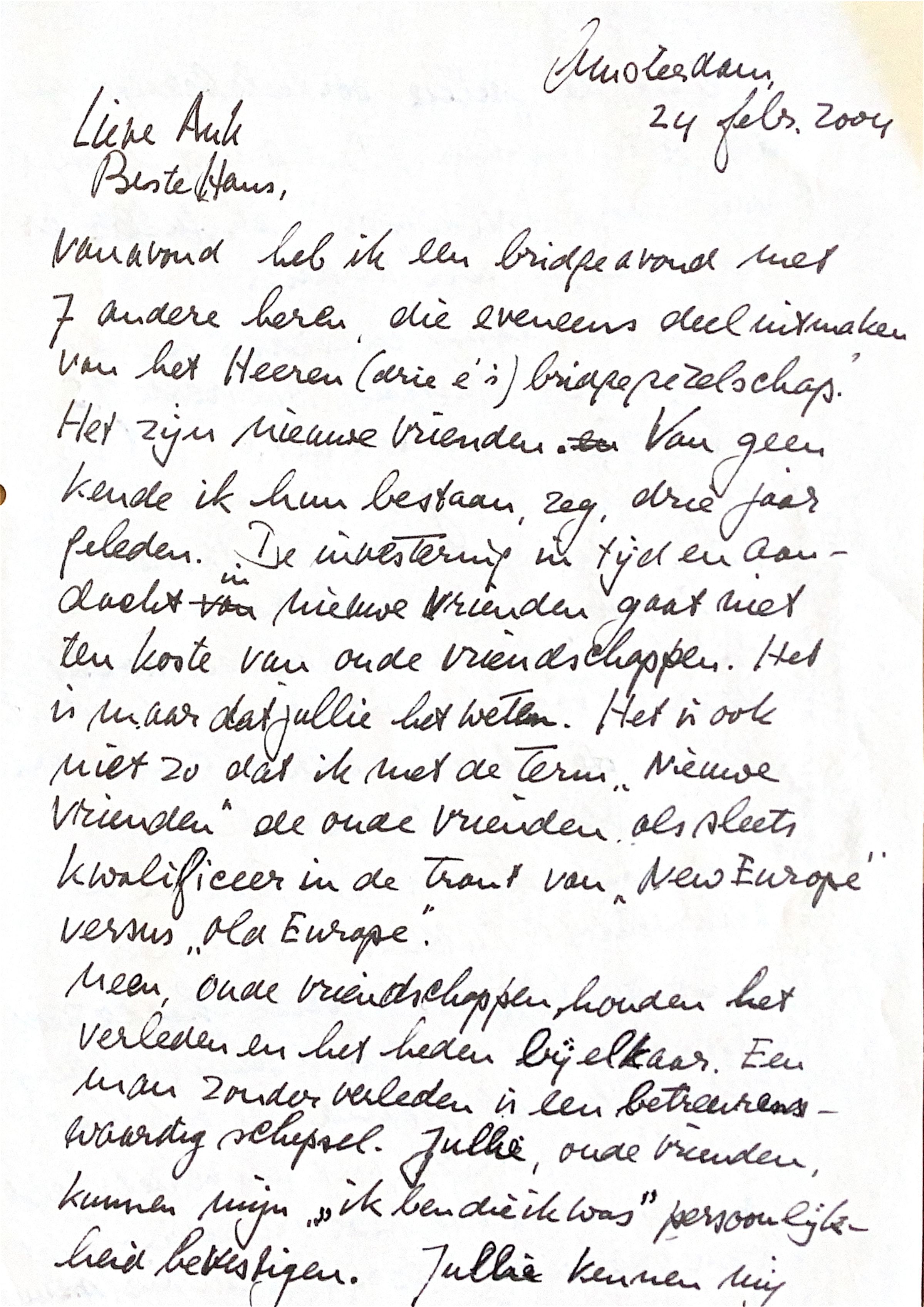De investering in tijd en aandacht in nieuwe vrienden gaat niet ten koste van oude vriendschappen. Het is maar dat jullie dat weten. Het is ook niet zo, dat ik met de term "nieuwe vrienden" de oude vrienden als sleets kwalificeer in de trant van "new Europe versus old Europe". Neen, oude vriendschappen houden het verleden en het heden bij elkaar. Een man zonder verleden is een betreurenswaardig schepsel.Oude vrienden, zoals jullie, kunnen mijn " ik ben, die ik was persoonlijkheid " bevestigen. Jullie kennen mij zolang, dat jullie oordeelsbevoegd zijn door op te merken: "Dat is niet de stijl van Aadje Dirkzwager", als er bij jullie naar een vermeende hebbelijkheid van mij gevraagd zou worden.