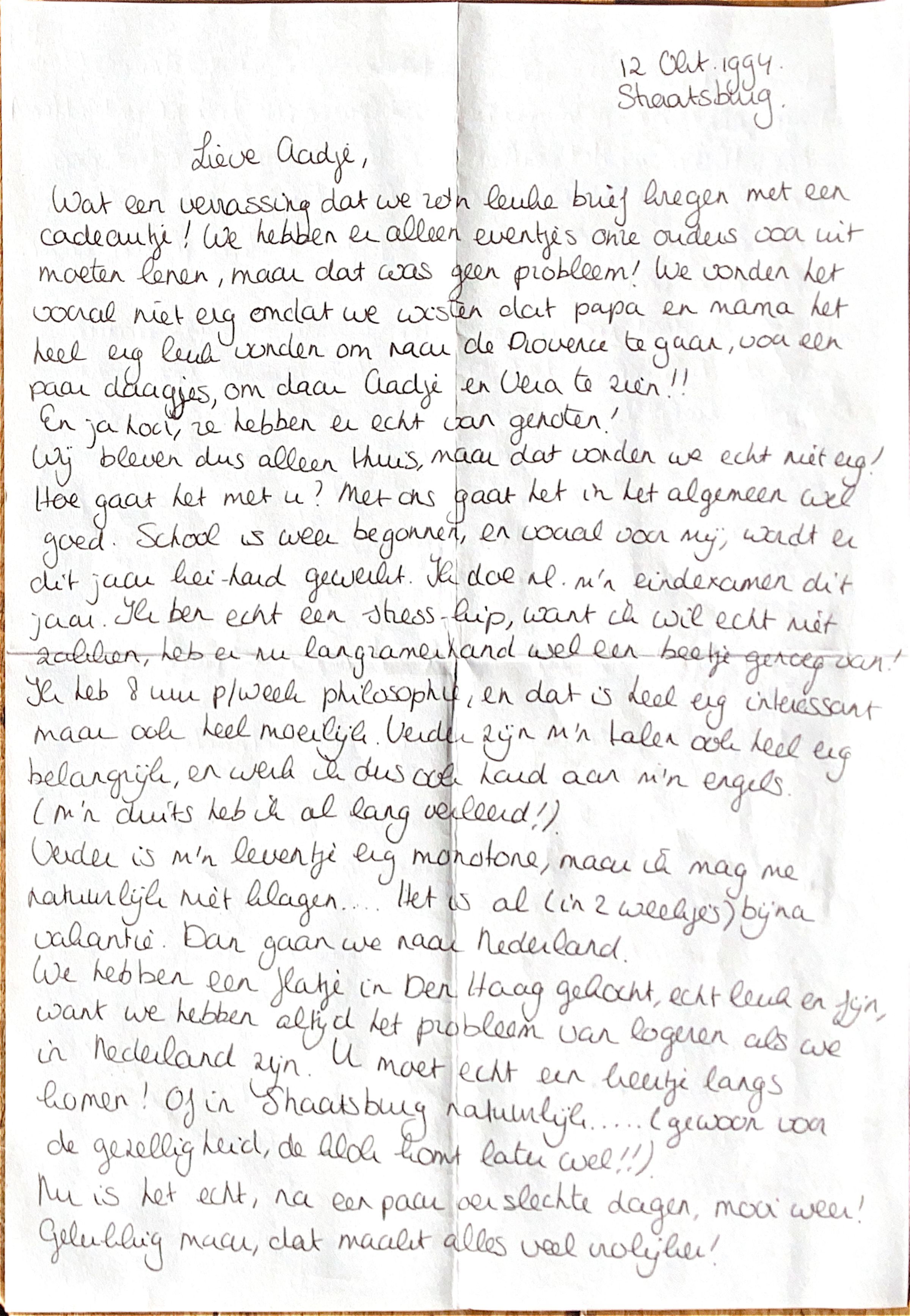 Lieve Aadje, ik ga nu maar stoppen; m'n bedje roept me. (Jammer genoeg bent u er niet om een postpakketje te maken). In ieder geval heel veel liefs, en nogmaals heel erg bedankt voor de brief en de duifjes ! Ik vond het heel erg leuk om weer iets van u te horen.