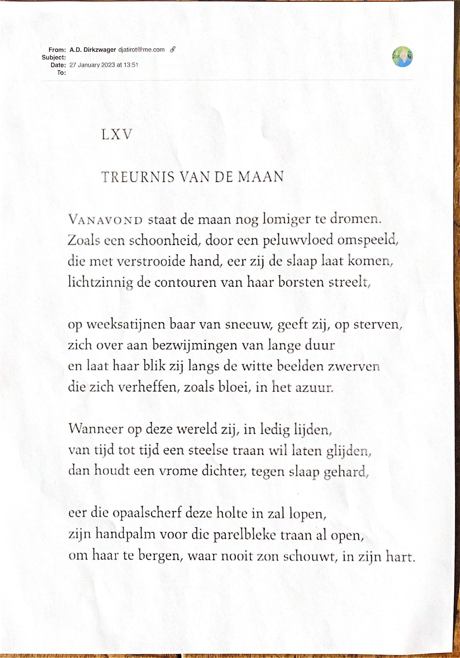 Hierbij stuur ik nog één van mijn lievelingsgedichten. Het is het gedicht "Tristesses de la Lune" van Charles Baudelaire (1821-1867) uit zijn gedichtenbundel "Les Fleures du mal."