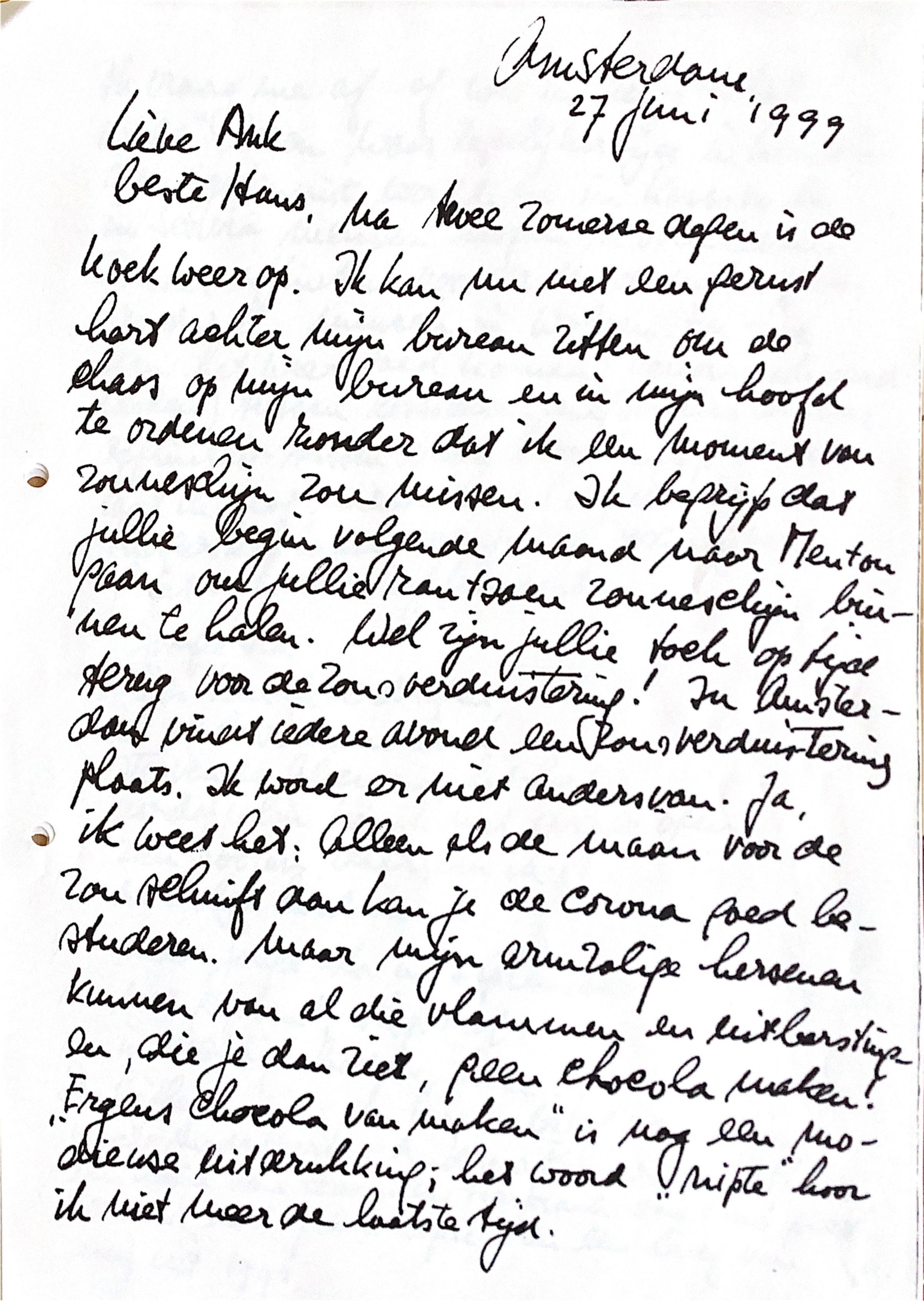 In Amsterdam vindt ieder avond een zonsverduistering plaats, ik word er niet anders van. Ja, ik weet het: Alleen als de maan voor der zon schuift, dan kan je de corona goed bestuderen. Maar mijn armzalige hersenen kunnen van al die vlammen en uitbarstingen, die je dan ziet, geen chocola van maken. "Ergens Chocola van maken" is nog een modieuze uitdrukking; het woord "nipte" hoor je niet meer de laatst tijd.