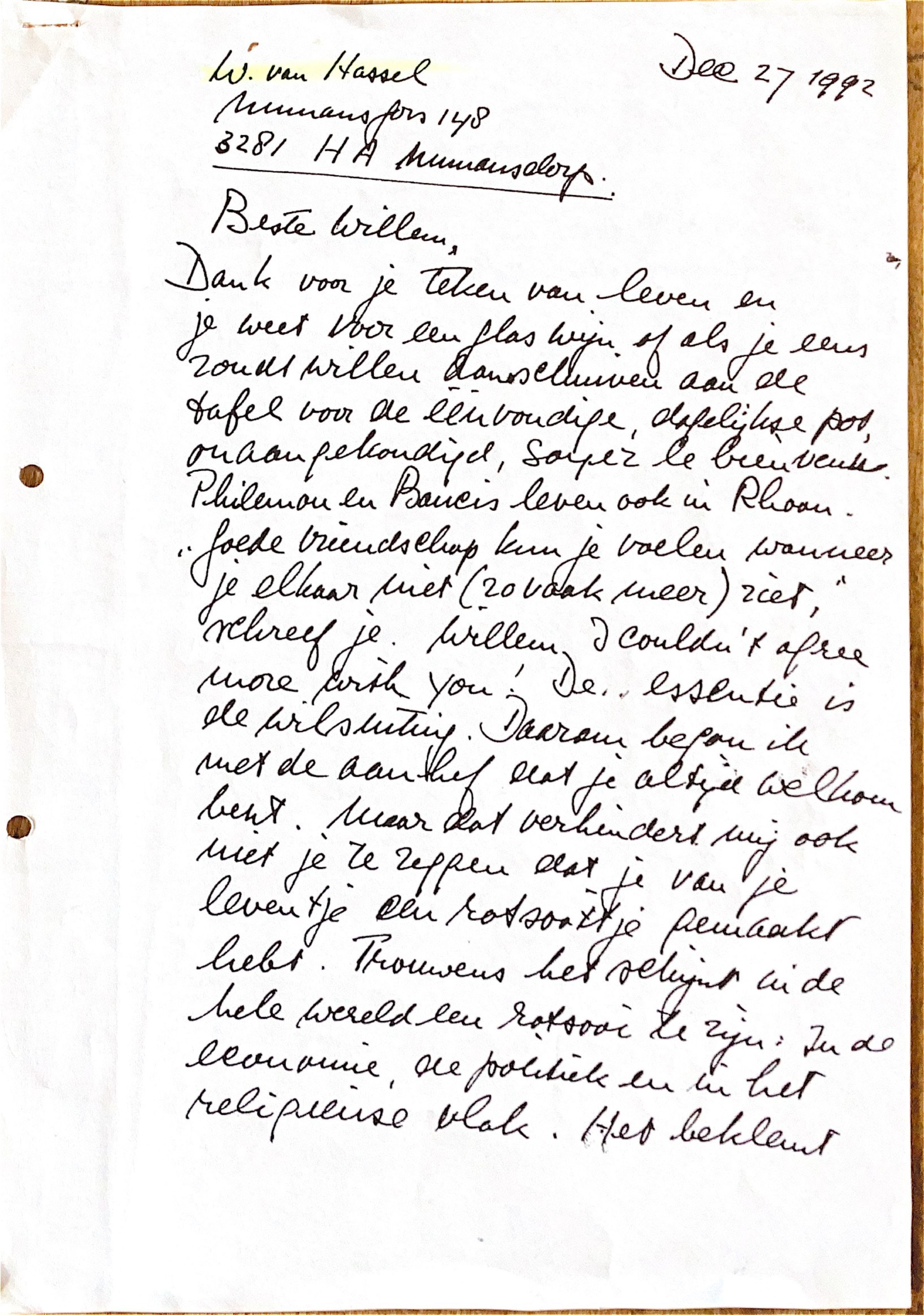 "Goede vriendschap kun je voelen als je elkaar niet (zo vaak meer) ziet", schreef je. "I couldn't agree more !" De essentie is de wilsuiting. Daarom beantwoord ik in de aanhef van deze brief, dat jij altijd welkom bent in huize Dirkzwager. Maar dat verhindert mij niet te schrijven, dat je van je leven een rotsooitje gemaakt hebt. Trouwens het schijnt in heel de wereld een rotsooi te zijn. Te weten in de economie, de politiek en in het religieuze vlak. Het beklemt mij wel een beetje, hoor, deze verspilling van tijd en kundigheid.