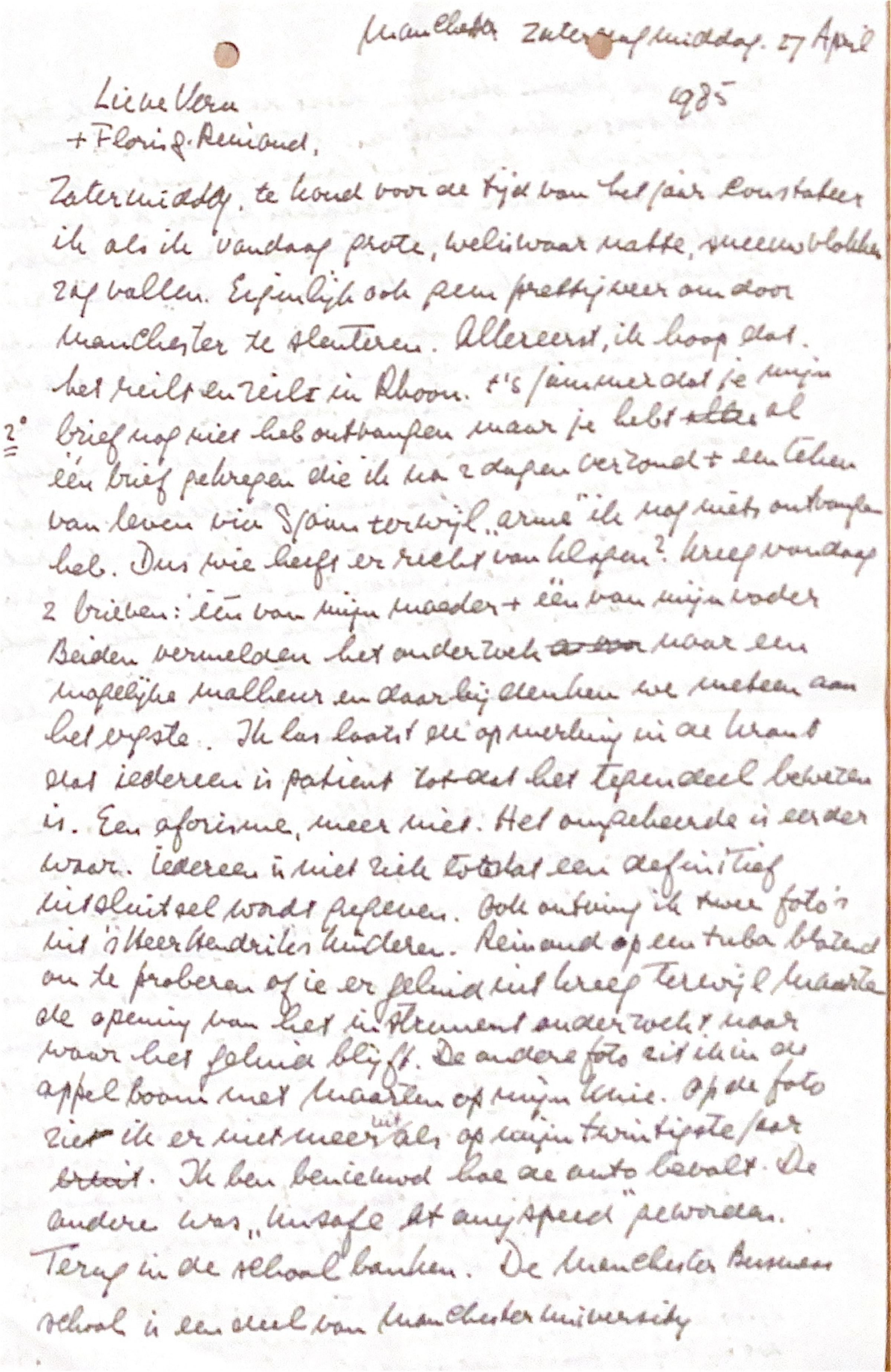 Zaterdagmiddag, te koud voor de tijd van het jaar constateer ik, als ik vandaag grote, weliswaar natte, sneeuwvlokken zag vallen. Eigenlijk geen prettig weer om door Manchester te slenteren. Allereerst, ik hoop dat het reilt en zeilt in Rhoon. Het is jammer dat je mijn 2de brief nog niet hebt ontvangen, maar je hebt al één brief gekregen, die ik na 2 dagen hier verzond + een teken van leven via Sjaan, terwijl "arme" ik nog niets ontvangen heb. Dus wie heeft er recht van klagen? Ik kreeg vandaag twee brieven: één van mijn moeder + één van mijn vader. Beiden vermelden het onderzoek naar een mogelijk malheur en daarbij denken we meteen aan het ergste. Ik las laatst de opmerking in de krant, dat iedereen is patient totdat het tegendeel is bewezen.Het is een aforisme, meer niet. Het omgekeerde is eerder waar. Iedereen is niet ziek totdat een definitief uitsluitsel wordt gegeven. Ook ontving twee foto's uit 's-HeerHenrikskinderen. Op de ene foto zie je Reinoud op een tuba blazen om te proberen of er geluid uitkomt, terwijl Maarten Dirkzwager de opening van het instrument onderzoekt en zich afvraagt waar het geluid blijft? Op de andere foto ben ik afgebeeld zittend in de appelboom met Maarten op mijn knie. Op die foto zie ik er niet meer zo jeugdig uit als toen ik twintig was. (klopt, de schrijver v.d. brief was toen 44 jaar; ADD). Ik ben benieuwd hoe de auto bevalt? De vorige was "unsafe at any speed" geworden. Terug naar de schoolbanken.