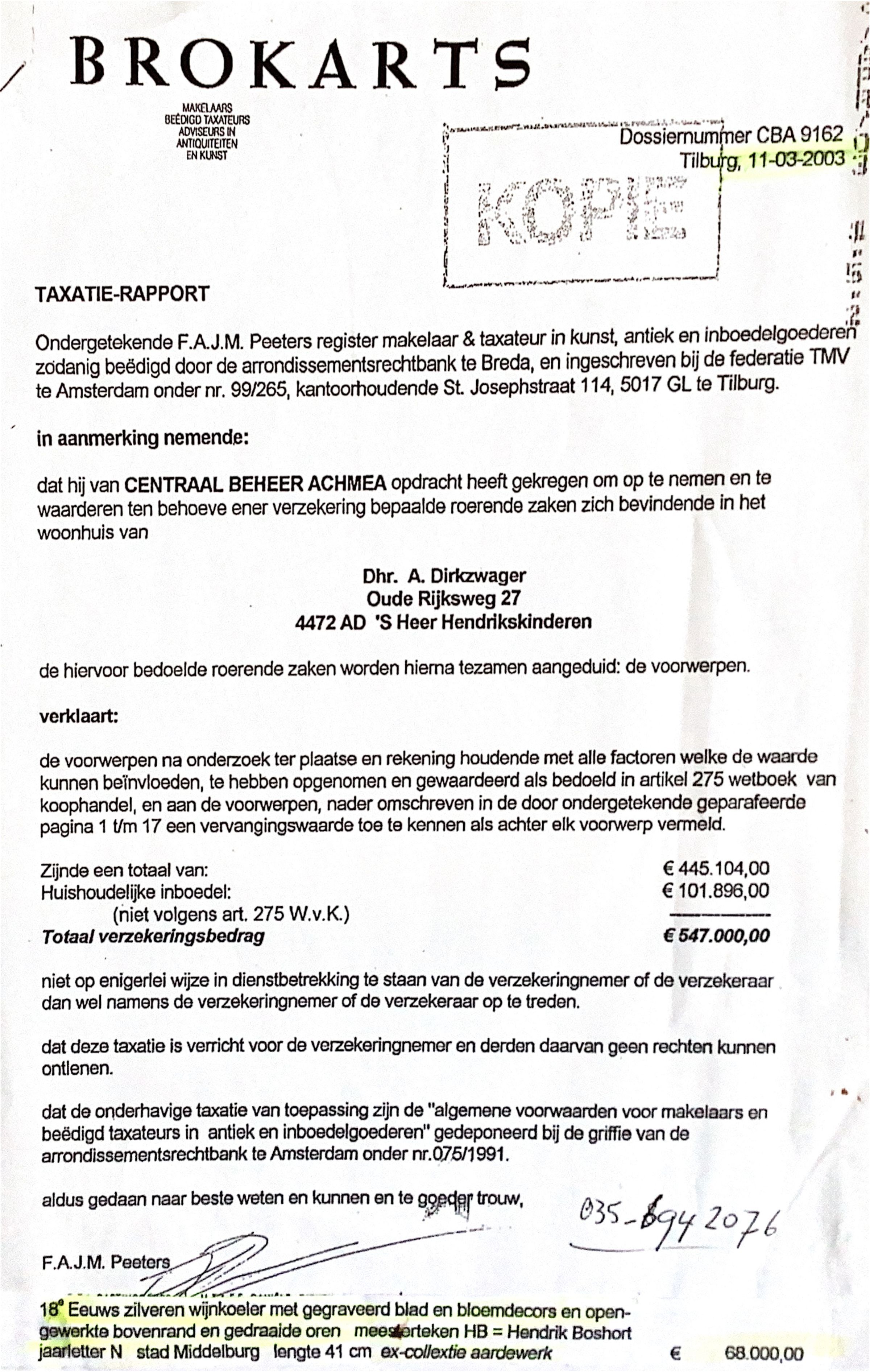 2003-03-11 Inboedelverzekering v. Ab en Bertie v. Oude Rijksweg 27 te sHKK. De wijnkoeler is weer teruggekocht door Aardewerk voor E 25.000,- in 2014.