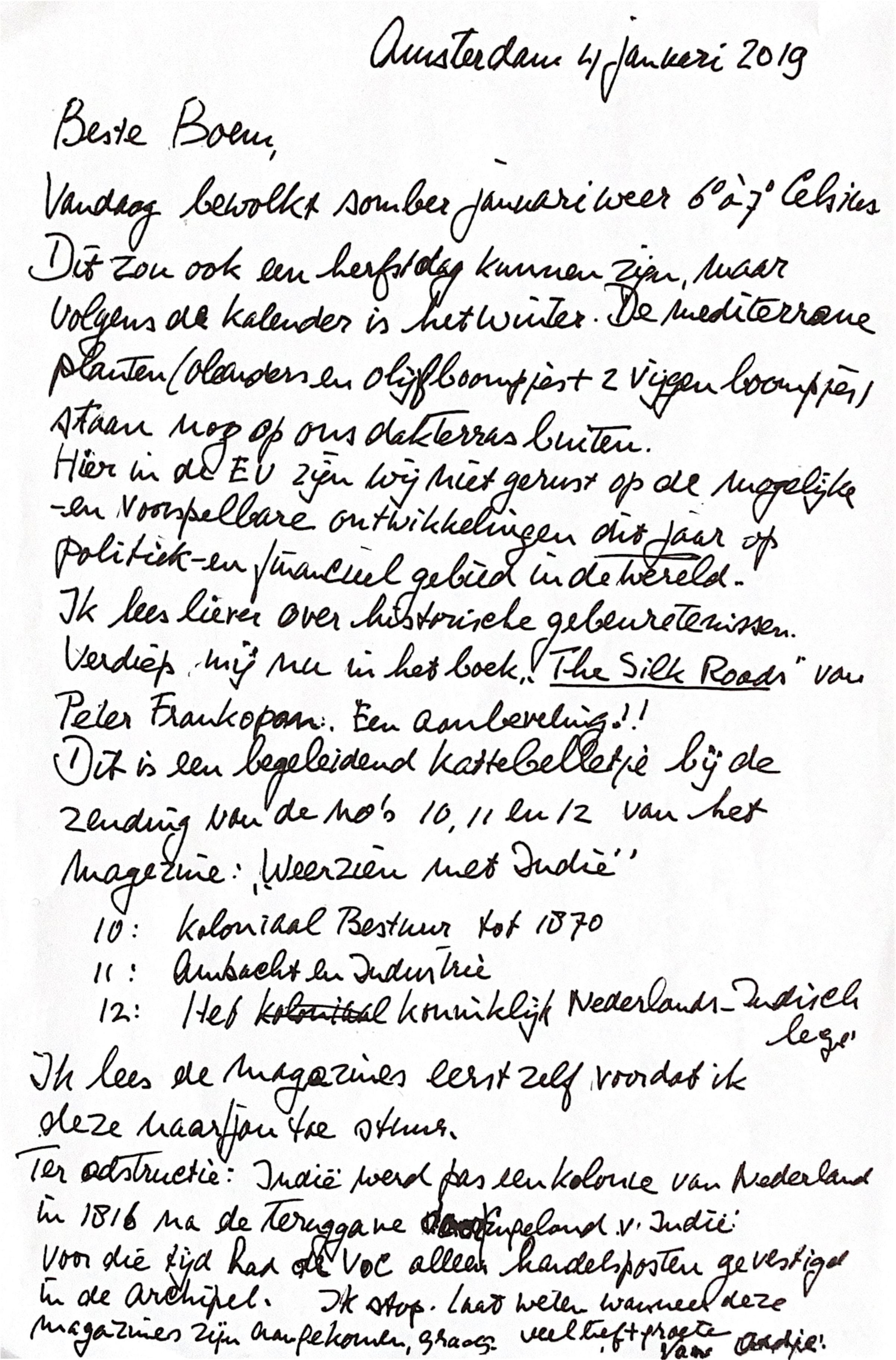 2019-01-04 Begeleidend kattebelletje bij de verstuurde Magazines naar Boem in Jakarta.