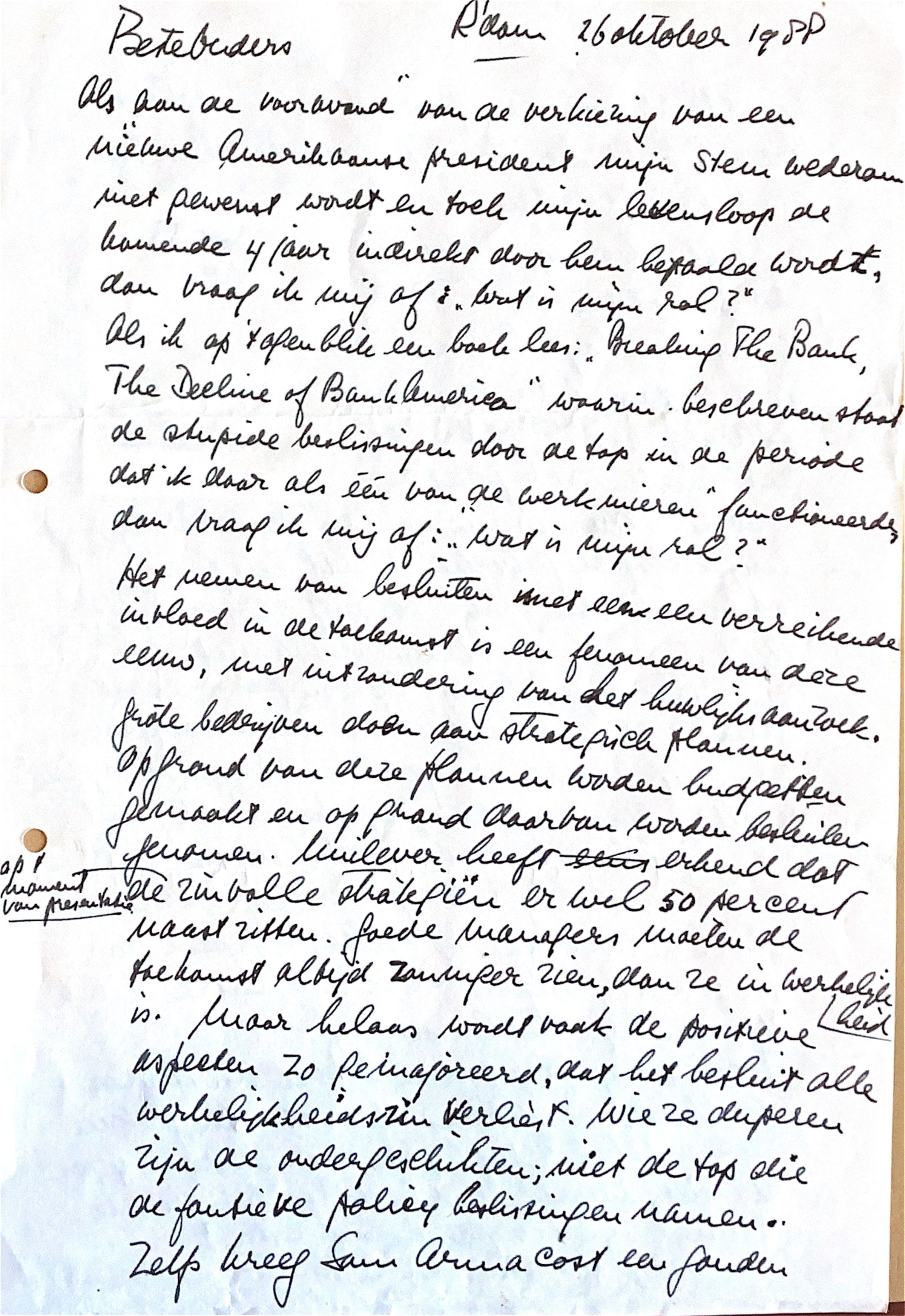 Als ik op 't ogenblik het boek lees: Breaking the Bank; The Decline of Bank of America Nt & SA., waarin beschreven staat de stupide beslissingen van Top-management in de periode dat ik daar als één van de werkmieren functioneerde, dan vraag ik mij af: " Wat is mijn rol?