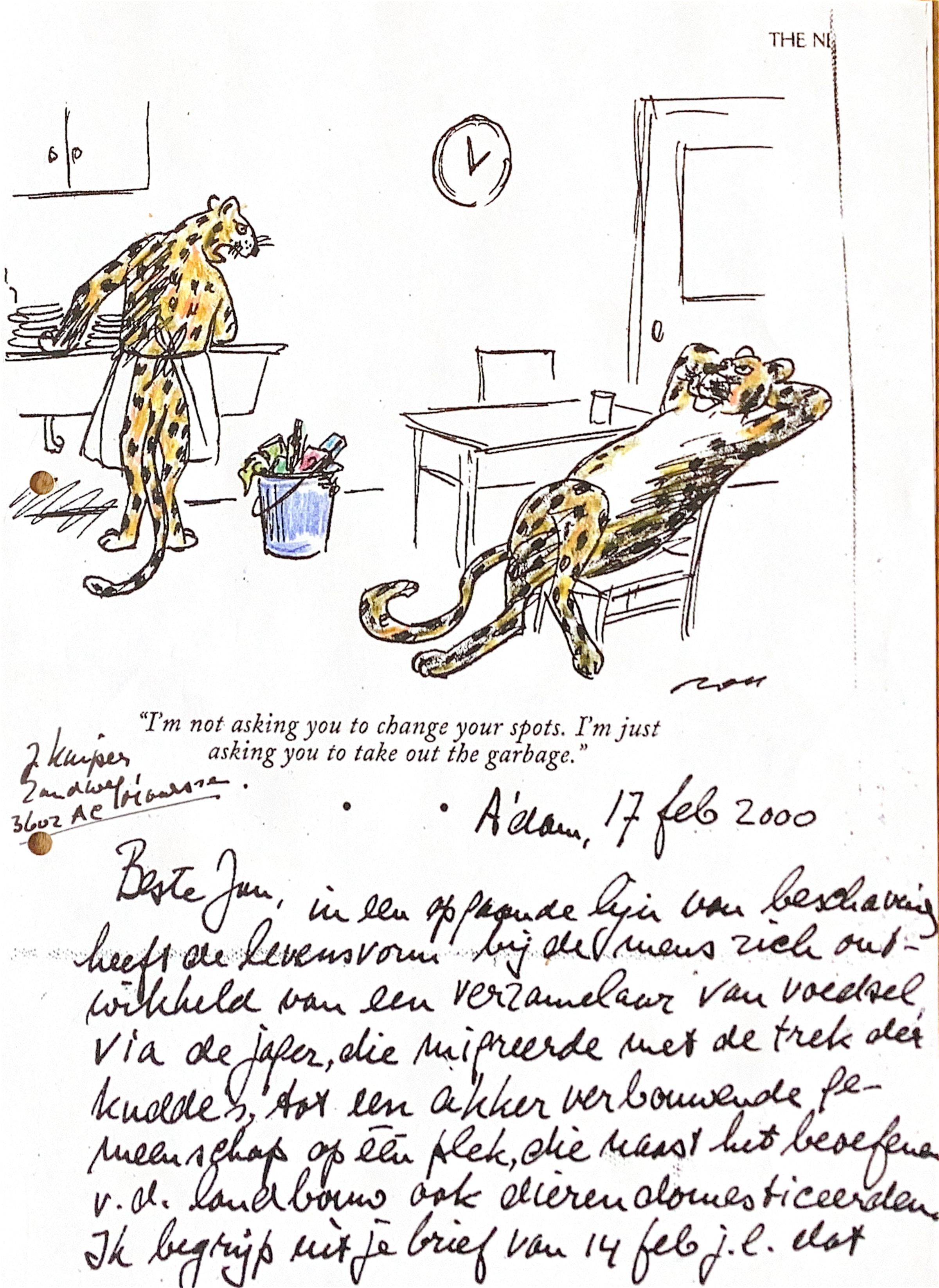 Ik begrijp uit de tekst van je brief van 14 februari j.l. dat het domesticatie-proces van Astrid resultaten begint af te werpen. De jachtinstincten worden beteugeld en de ruwe bolster wordt een gepolijst een musea -en expositie-bezoeker om salonfähig te zijn in kringen, waar het niet "bon ton" is om te verhalen over de grote hoeveelheid bier , die je op de "vader & zonen-dag`" naar binnen gezwelgd hebt. Jan, pas toch op, dat het allemaal niet ten koste van je oorspronkelijkheid gaat: die ontwapende éénvoud van jou !