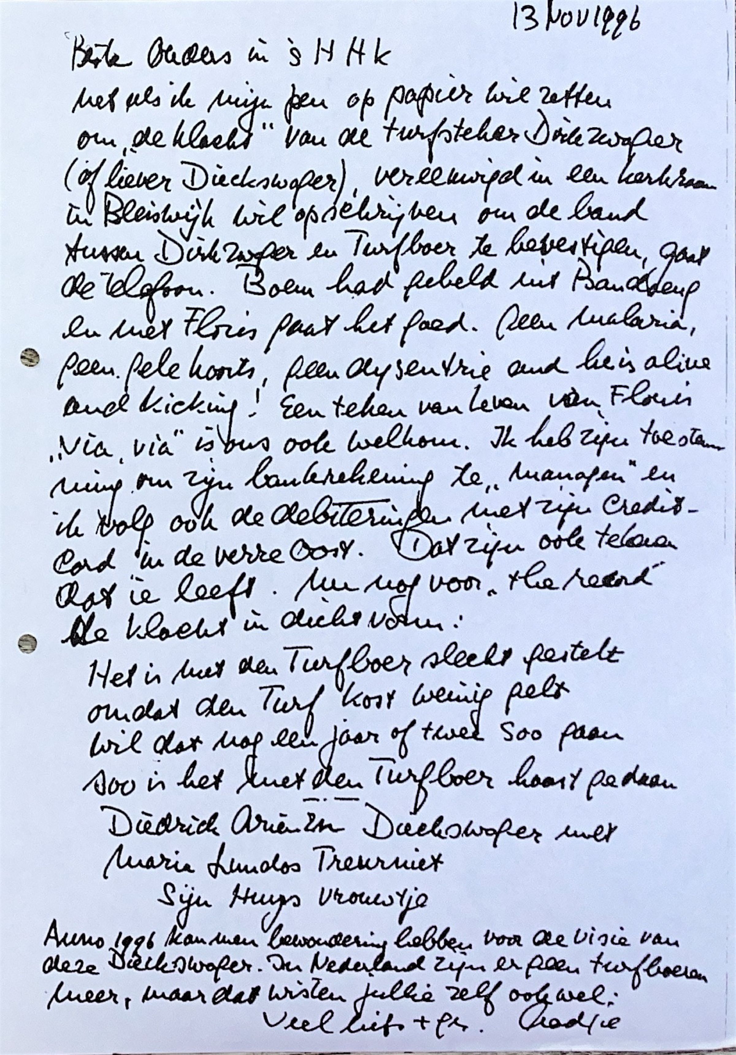 Net als ik mijn pen op papier wil zetten om de klacht van de turfsteker Dirkzwager (of liever Dieckswager) vereeuwigd in een kerkraam te Bleiswijk wil opschrijven om de band tussen Dirkzwager en Turfboer te bevestigen, gaat de telefoon. Boem belde vanuit Bandoeng en met Floris gaat het goed. Hij lijdt niet aan malaria, niet aan Gele koorts en ook niet aan dysenterie "and he is a.live and kicking !" Een teken van leven van Floris "via via" is ons ook welkom.