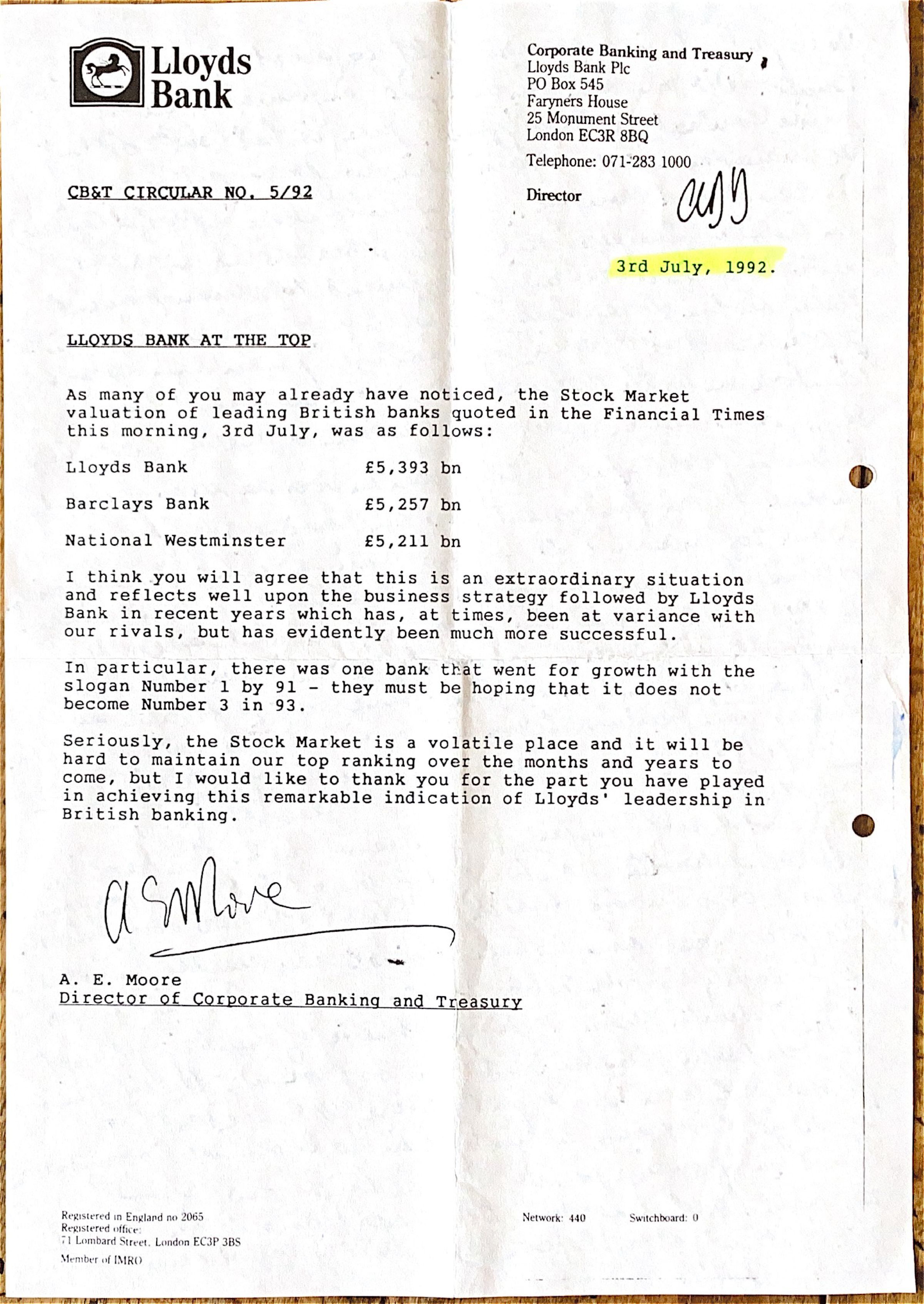 The Lloyds Bank is ongeveer half zo groot als Barclays Bank. Dit gegeven is essentieel om de informatie in de CB&T Circular NO. 5/92 te begrijpen.