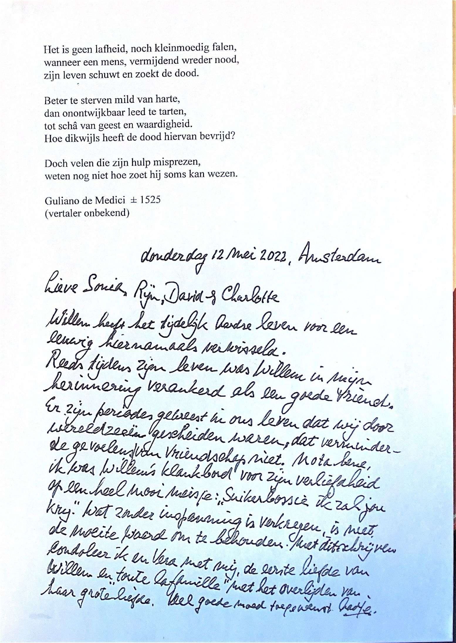 Met dit schrijven condoleer ik en Vera met mij, de eerste liefde van Willem en "toute la famille"met het overlijden van haar grote liefde.