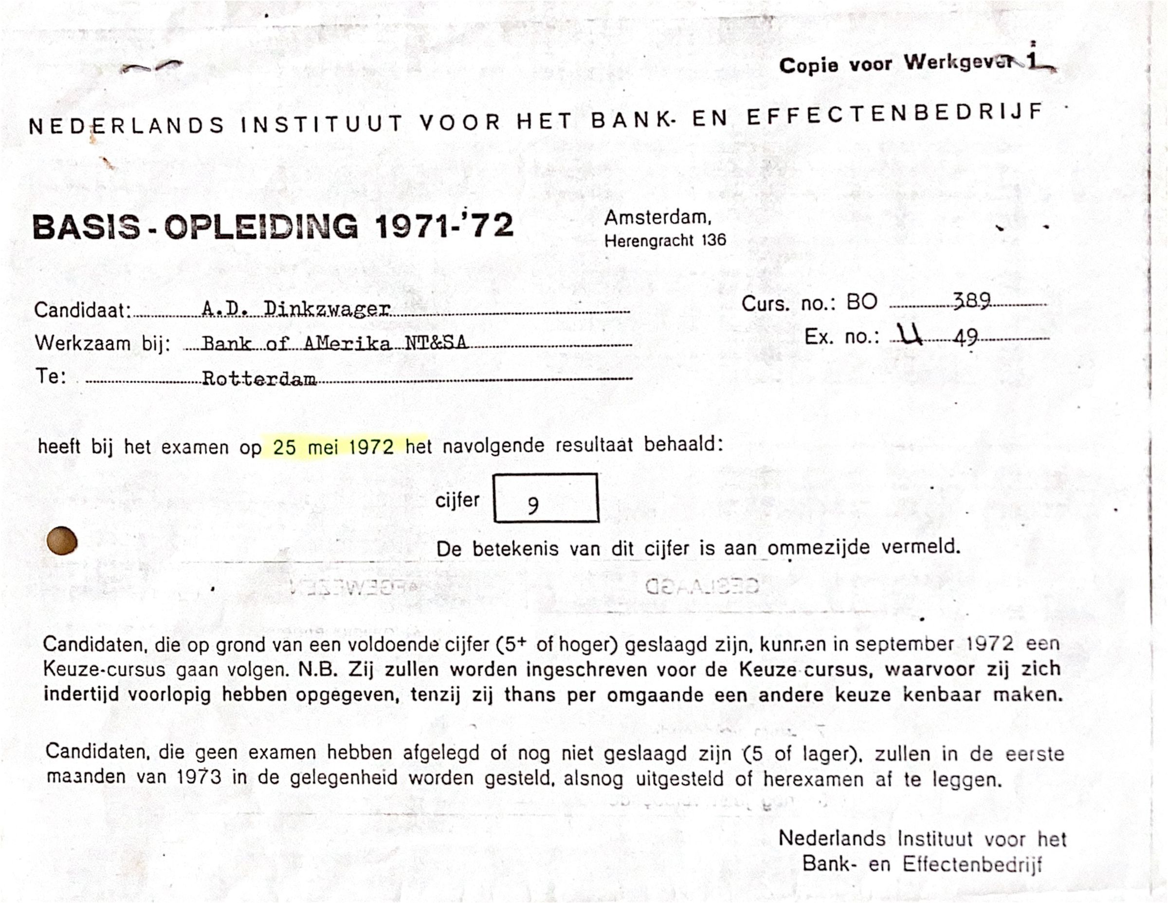 Dit is de eerste 9, die ik ooit gehaald heb in mijn leven. Een 9 betekent zeer goed. Daarna heb ik mij niet meer ingeschreven voor een vervolg-deeltentamen v.d. Bankcursus. "Training on the job" heeft mij verder opgeleid in het bankval.