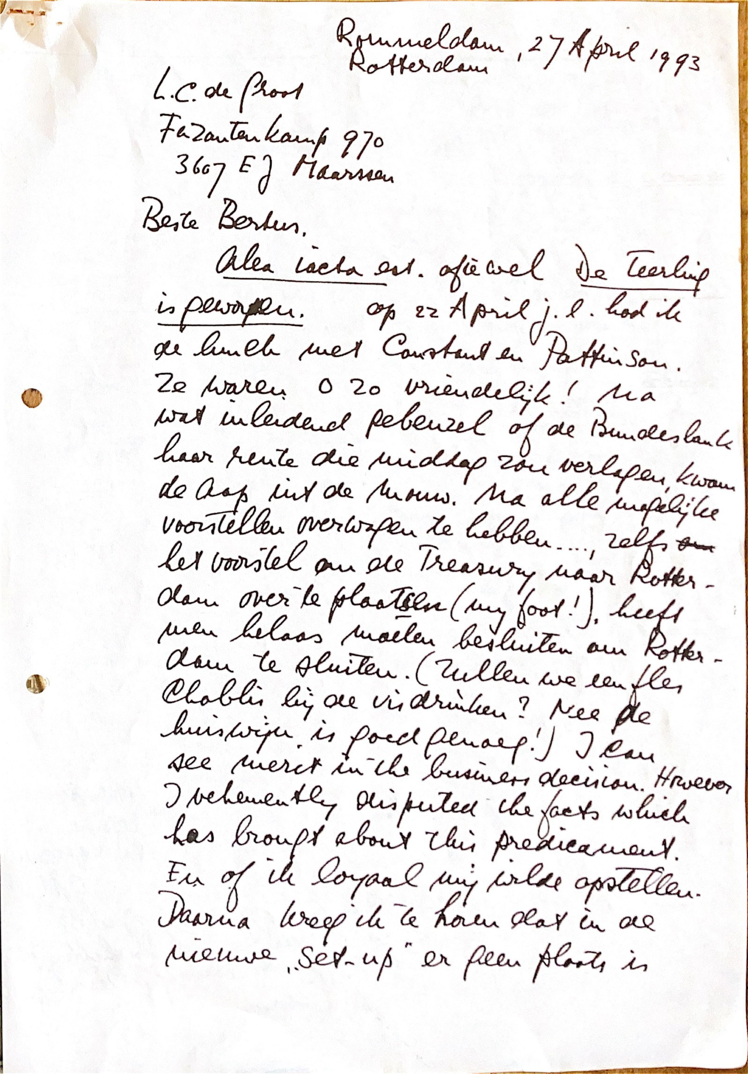 " Na alle mogelijke voorstellen overwogen te hebben...., zelfs het voorstel om de "'Treasury" naar Rotterdam over te plaatsen (my foot I), heeft men helaas moeten besluiten om Rotterdam te sluiten. (Zullen we een fles Chablis bij de vis drinken? Neen, antwoordde ik, de huiswijn is goed genoeg)".