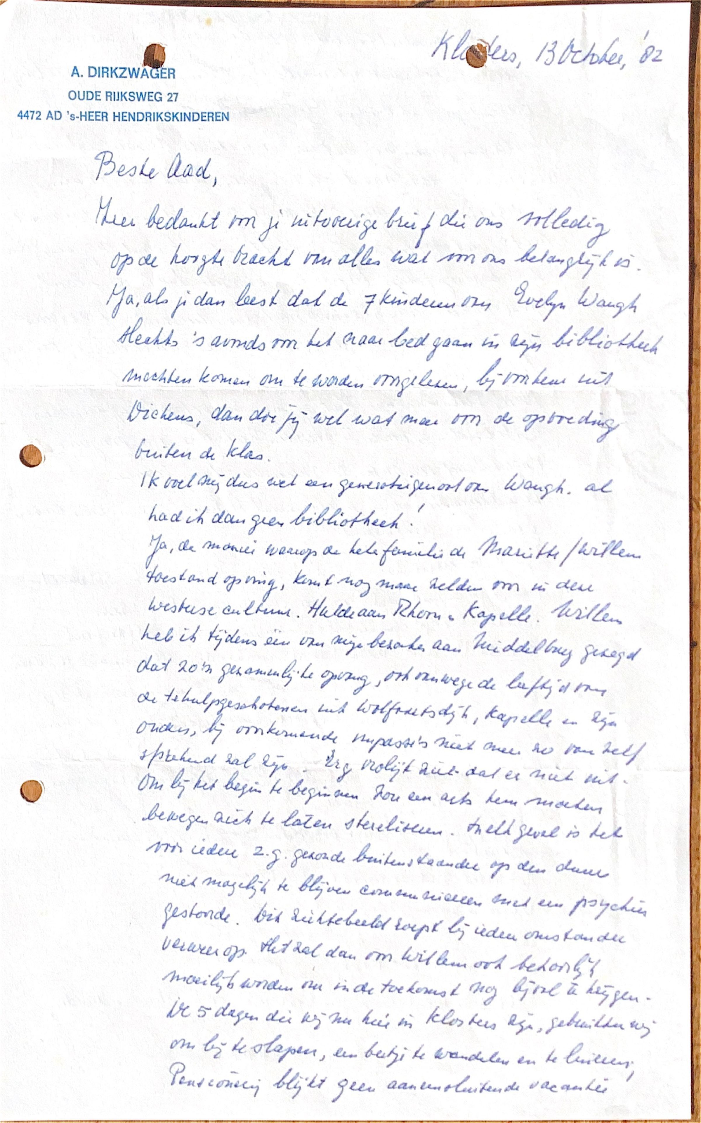 Zeer bedankt voor je uitvoerige brief, die ons volledig op de hoogte bracht wat voor ons belangrijk is. Ja, als je dan leest dat de 7 kinderen van Evelyn Waugh slechts 's-avonds voor het naar bed gaan in zijn bibliotheek mochten komen om te worden voorgelezen, bij voorkeur uit verhalen van Dickens, dan doe jij wel wat meer voor de opvoeding buiten de klas.