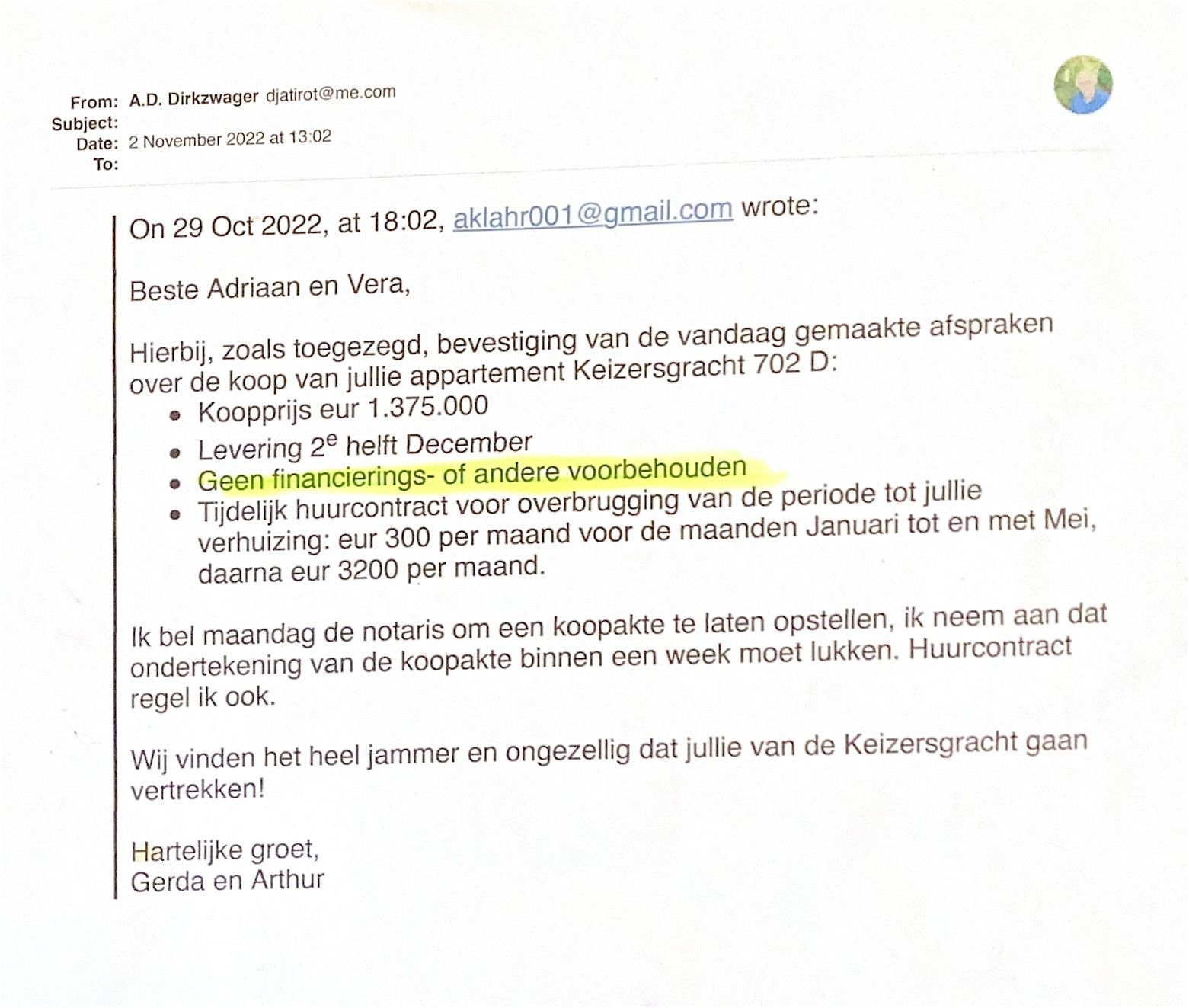 2022-11-02 bevestiging van verkoopcondities voor het appartement Keizersgracht 702D.
