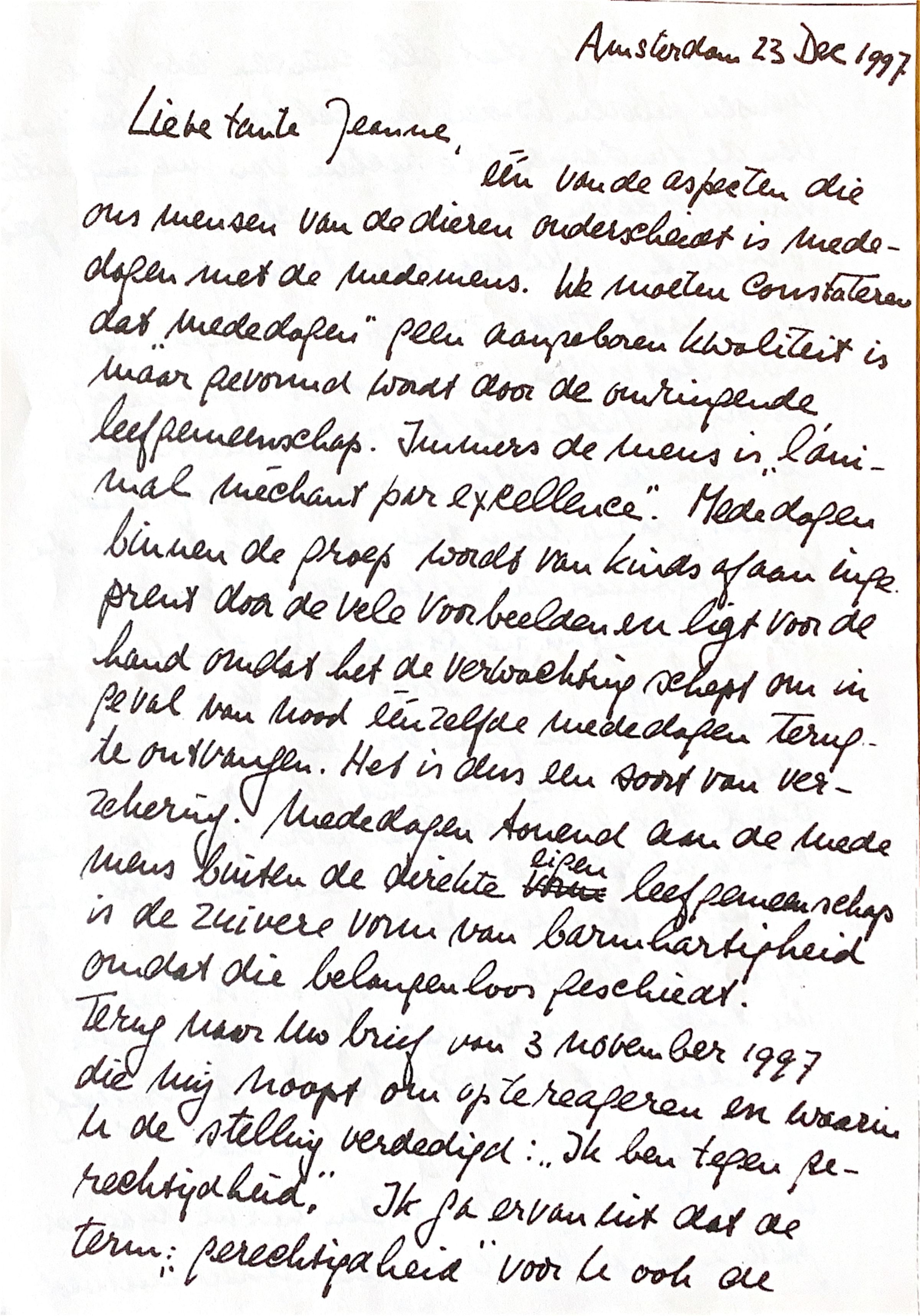 Terug naar uw brief van 3 november 1997, die mij noopt om op te reageren en waarom u de stelling verdedigd: "Ik ben tegen gerechtigheid." Ik ga er vanuit dat de term "gerechtigheid"voor u ook de inhoud heeft dat alle mensen als vrije mensen geboren worden en zich kunnen bedienen van de fundamentele rechten van meningsuiting, van vergaderen en kunnen beschikken over persvrijheid. Wie kan daar tegen zijn?