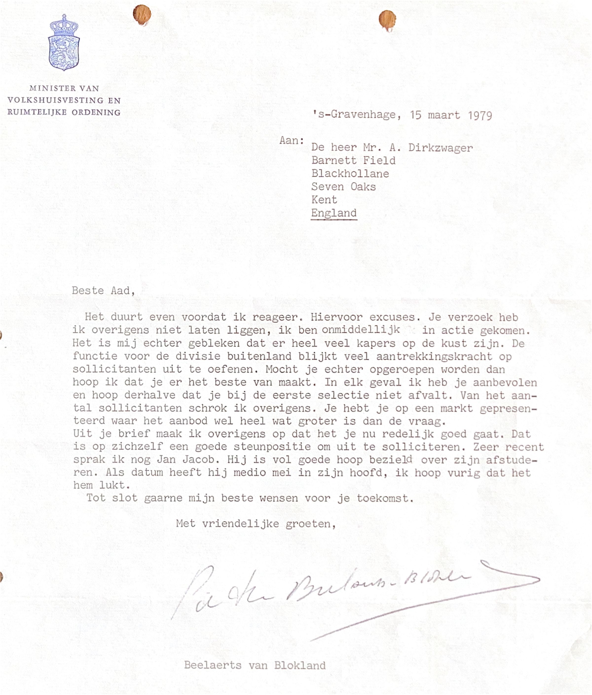 Het duurt even voordat ik reageer. Hiervoor excuses. Je verzoek heb ik overigens niet laten liggen, ik ben onmiddellijk in actie gekomen. Het is mij echter gebleken dat er heel veel kapers op de kust zijn. De functie voor de divisie buitenland blijkt veel aantrekkingskracht op sollicitanten uit te oefenen. Mocht je echter opgeroepen worden dan hoop ik dat je er het beste van maakt. In elk geval ik heb je aanbevolen en hoop derhalve dat je bij de eerste selectie niet afvalt. Van het aantal sollicitanten schrok ik overigens. Je hebt je op een markt gepresenteerd waar het aanbod wel heel wat groter is dan de vraag. Uit je brief maak ik overigens op dat het je nu redelijk goed gaat. Dat is op zichzelf een goede steunpositie om uit te solliciteren. Zeer recent sprak ik nog Jan Jacob. Hij is vol goede hoop bezield over zijn afstuderen. Als datum heeft hij medio mei in zijn hoofd, ik hoop vurig dat het hem lukt. Tot slot gaarne mijn beste wensen voor je toekomst.