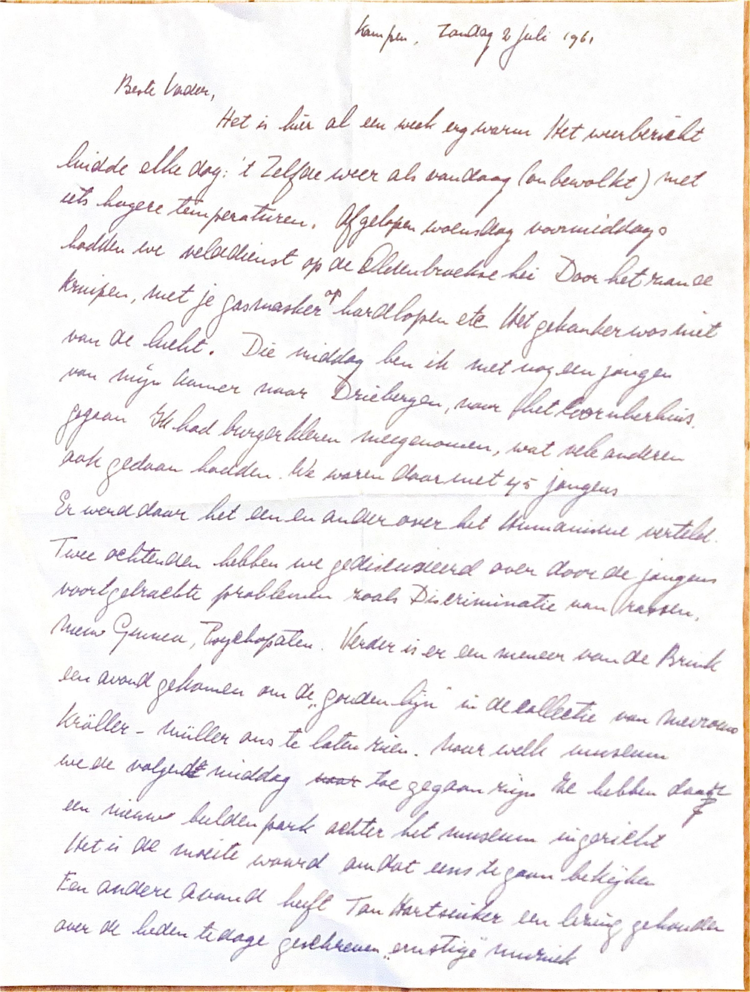 Het is hier al een week erg warm. Het weerbericht luidde elke dag: 't zelfde als vandaag (onbewolkt) met hogere temperaturen. Afgelopen woensdagvoormiddag hadden we velddienst op de Oldenbroekse hei. Door het zand kruipen, met je gasmasker hardlopen, etc. Het gekanker was niet van de lucht. Die middag ben ik met een jongen van mijn kamer Driebergen naar het Coornherthuis gegaan. Ik had burgerkleren meegenomen, wat velen anderen ook hadden. We waren daar met 45 jongens. Er werd daar het een en ander over het humanisme verteld. Twee ochtenden hebben we gediscussieerd over door de jongens voortgebrachte problemen, zoals discriminatie van discriminatie van rassen, Nieuw Guinea, psychopaten.