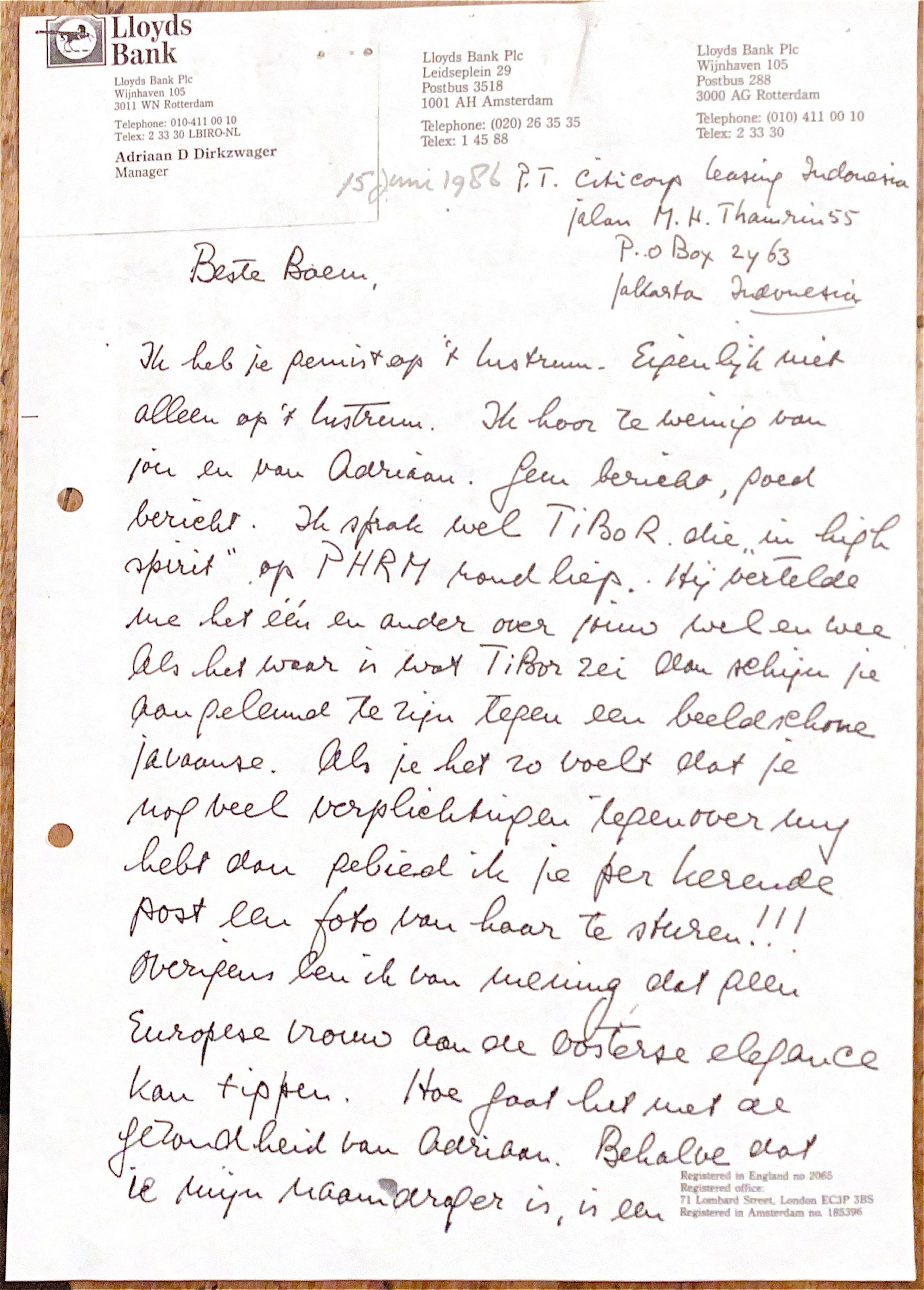 Boem, bloeit de City Lease onder jouw begenadigde leiding? Van tijd tot tijd zie ik Jan van Suchtelen, die nu voor Soc Gen. in Rotterdam werkt. Hij schijnt jou goed te kennen. Iets anders, ik heb Tibor aangeboden om een goed woordje te doen bij de bedrijven Internatio en Borsumij voor de import van overhemden. Hij wees beide namen resoluut af als zijnde: "boeven."