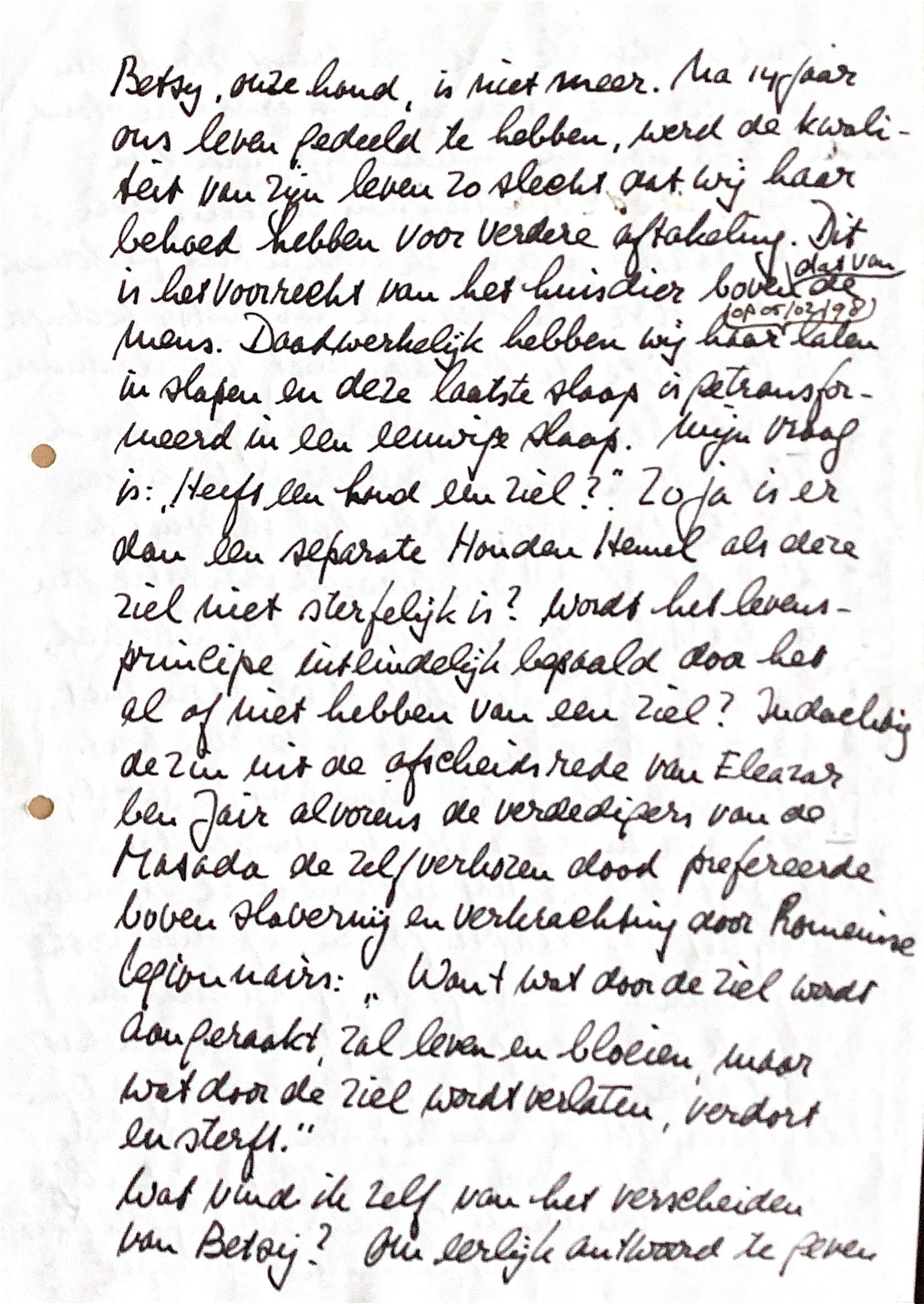 Wat vind ik zelf van het verscheiden van Betsy? Om eerlijk antwoord te geven, vond ik dat ik te veel in dienst stond van een dier, die lager in de hiërarchie stond door haar afhankelijkheid van mij, maar desalniettemin hoger in belangrijkheid in het gezin was geplaatst, dan arme ik. Ach, het is wat omslachtige uitgelegd, Ik werd te veel gedomesticeerd door een dier. Ik heb Betsy gedoogd. Ik verfoeide de gevechten met Jill, corgie nr 2. Het eten van paardenvijgen kon ik niet rijmen met de onverwachte likken, die ik dan van Jill kreeg. Uren heb ik soms gedwaald op zoek naar Betsy; Niet onvermeld mag blijven de irritatie van het