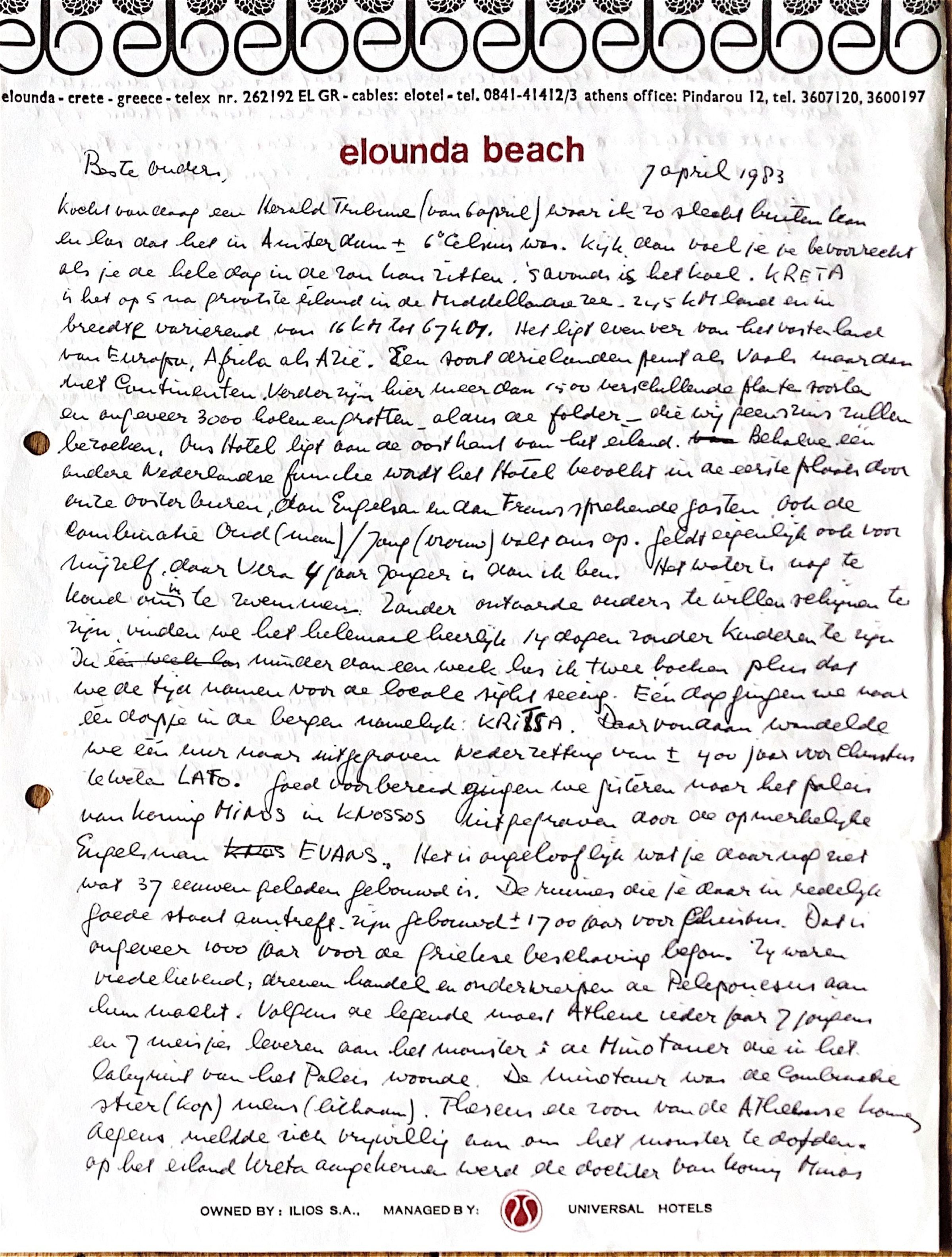 Het Paleis van Minos bevat zoveel kamers en gangen, dat het gangenstelsel gelijk een labyrint is. De sport, die daar als een volksvermaak werd opgevoerd, was het springen over een stier. De stier werd bij de horens gepakt en dan sprong men met een salto daarover heen. De afloop zal zeker vaak dodelijk geweest zijn. Dat spel werd naar alle waarschijnlijkheid in het "central court" opgevoerd. Ik zal proberen of ik in Nederland dit boek over Arthur Evans (1851-1941) voor je kan kopen, dan zie ik jullie ook nog wel eens naar Kreta reizen. Het Museum in Heraklion, stad nr 1 van Kreta, herbergt een buitengewone verzameling van gouden juwelen, kettingen en vazen, allemaal uit de tijd van ±2500 v.Chr tot ±1500 v.Chr. Heel bijzonder. Maar het verwonderlijke is, dat men voor het jaar 1900 A.D. geen notie had dat Knossos bestond. "Kreta vaut bien une visite."