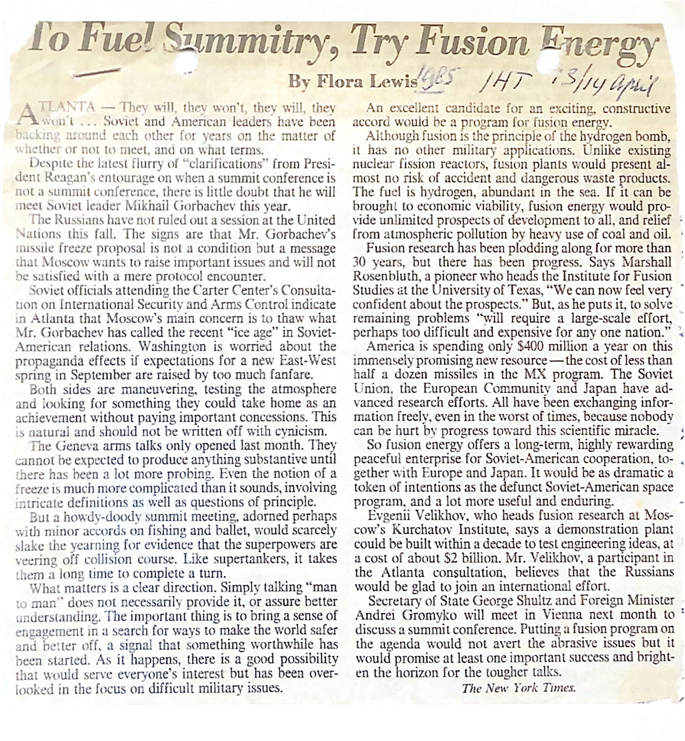 1985-04-15 Artikel in de International Herald Tribune over Kernfusie