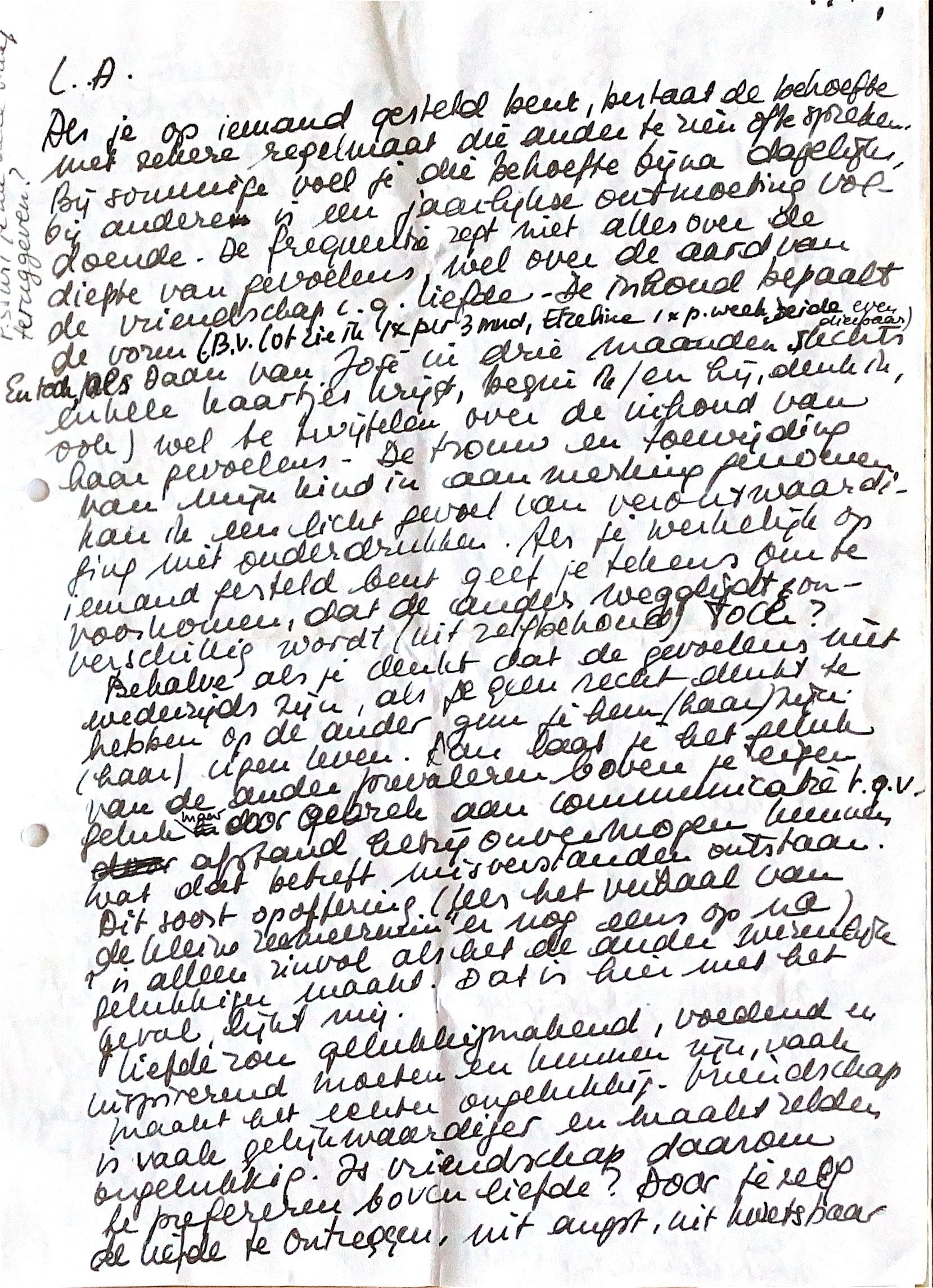 als je op iemand gesteld bent, bestaat de behoefte met zekere regelmaat die ander te zien en te spreken. Bij sommige voel je die behoefte bijna dagelijks bij anderen is een jaarlijkse ontmoeting voldoende. De frequentie zegt niet alles over de diepte van de gevoelens, wel over de aard van de vriendschap c.q. liefde. De inhoud bepaalt de vorm (B.V. Lot zie ik 1x per 3 maanden, Elzelien 1x per week; beiden even dierbaar. En toch, als Daan van José in drie maanden slechts enkele kaartjes krijgt, begin ik (en hij, denk ik, ook) wel te twijfelen over de inhoud van haar gevoelens.