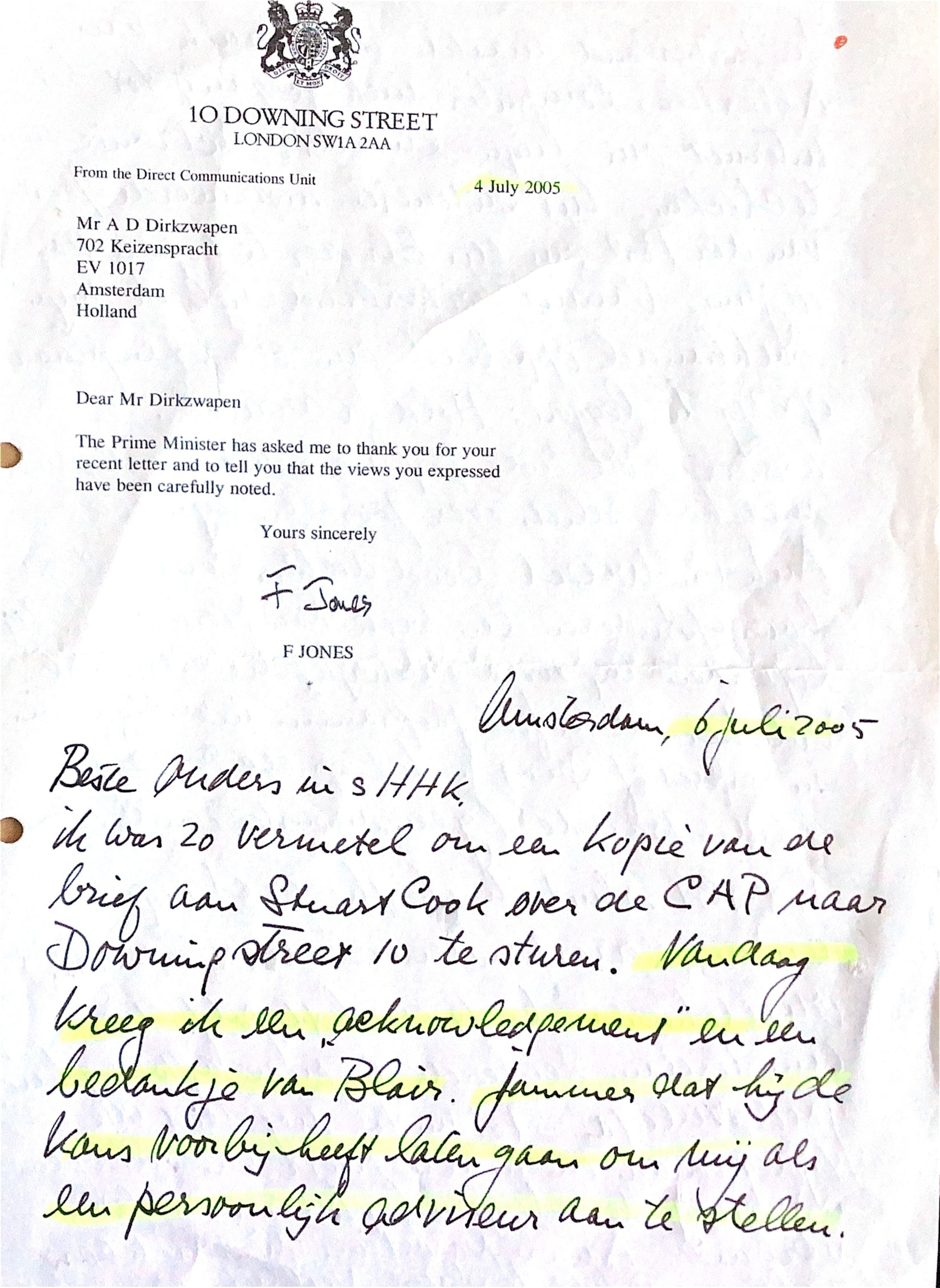 Vandaag kreeg een "acknowledgement" met een een bedankje van T.Blair. Jammer dat hij de kans voorbij heeft laten gaan om mij als een persoonlijk adviseur aan te stellen.