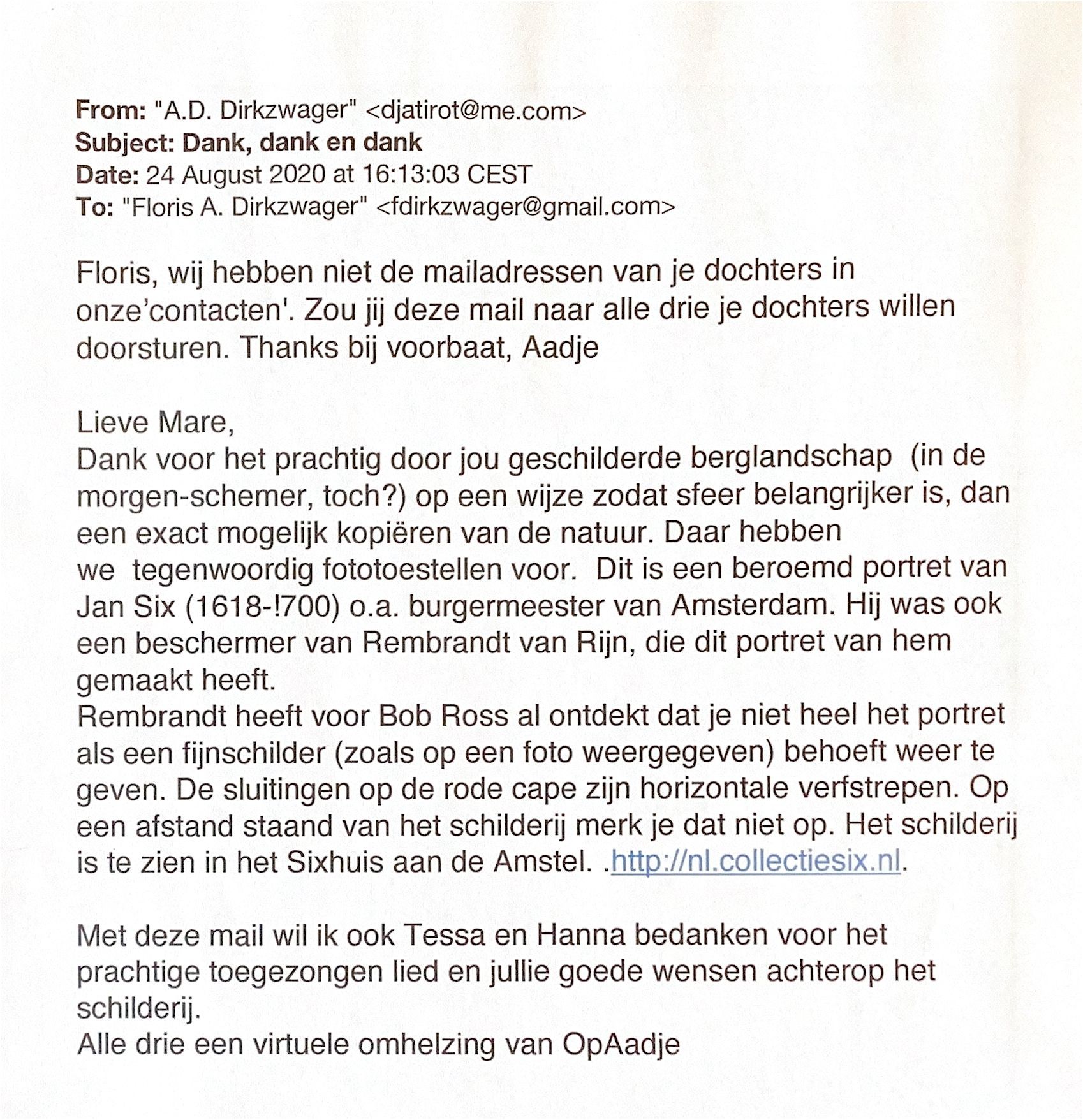2020-08-24 Bedankmail aan Mare, Tessa en Hanna voor hun bijdrage aan de viering van ADDs 80ste verjaardag.