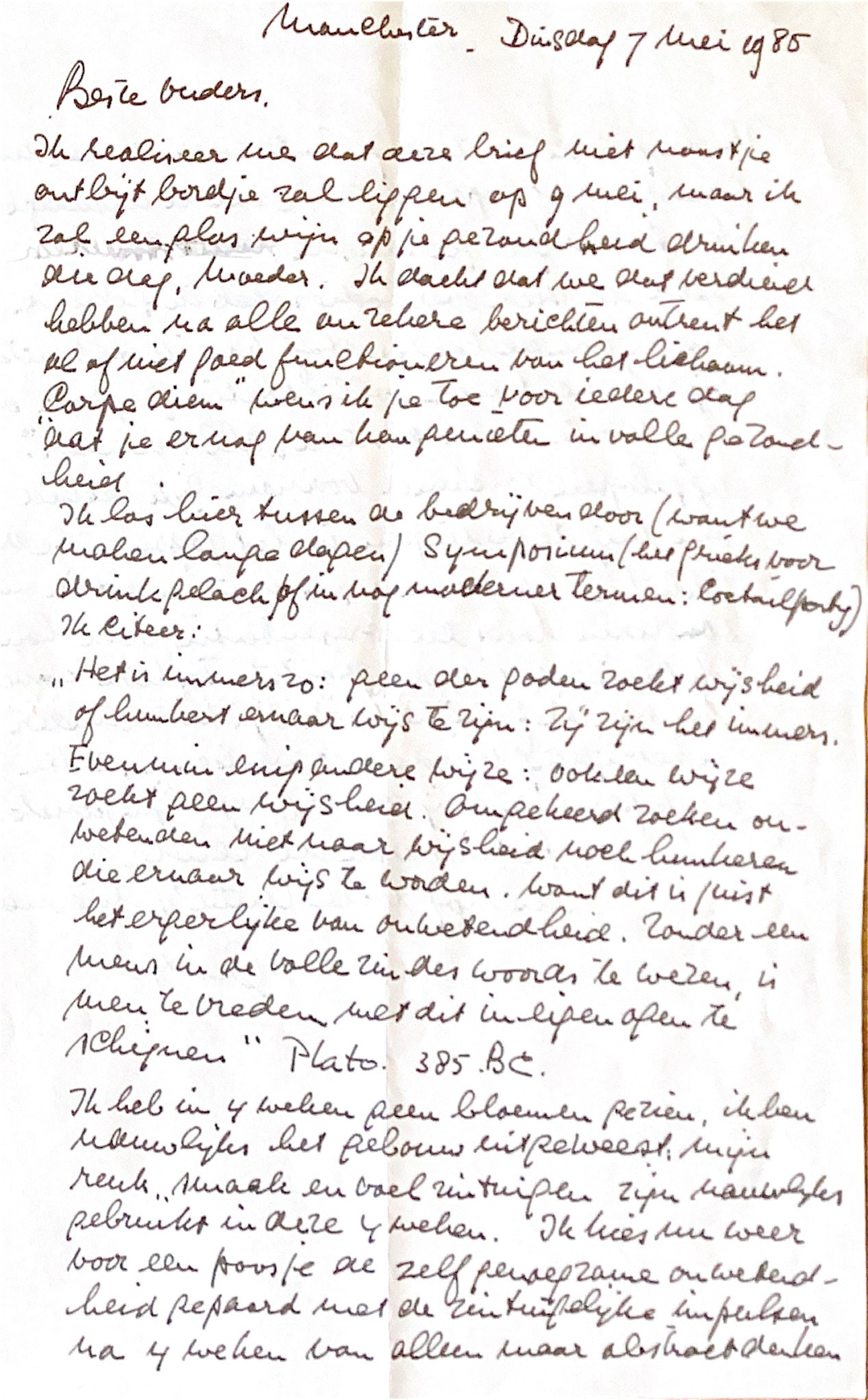 Ik realiseer me dat deze brief niet naast je ontbijtbordje zal liggen op 9 mei, maar ik zal een glas wijn op je gezondheid drinken die dag. Moeder, Ik dacht dat we dat verdiend hebben na alle onzekere berichten omtrent het. al of niet goed functioneren van je lichaam. "Carpe diem" wens ik je toe voor iedere dag, dat je er nog kan genieten in volle gezondheid.