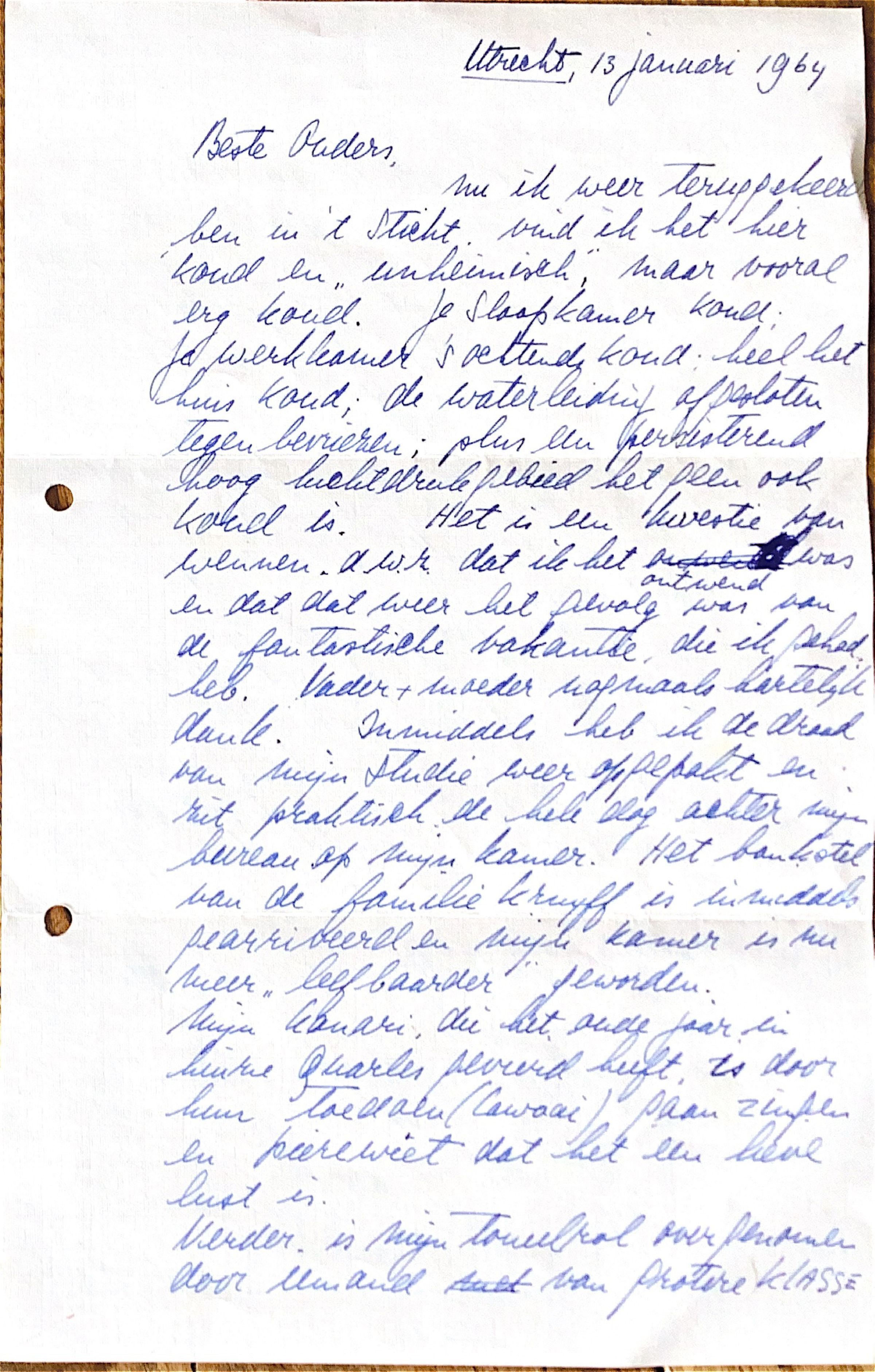 nu ik weer teruggekeerd ben in 't Sticht. vind ik het hier koud en "unheimisch". maar vooral erg koud Je slaapkamer koud, je werkkamer 's-ochens koud; heel het huis koud. De waterleiding afgesloten tegen bevriezen; plus een persisterende hoog luchtdruk gebied, hetgeen ook koud is. Het in een kwestie van wennen, d.w.z.dat ik het bet ontwend was, en dat weer het gevolg was van de fantastische vakantie, die ik gehad heb. Vader + moeder nogmaals hartelijk dank.