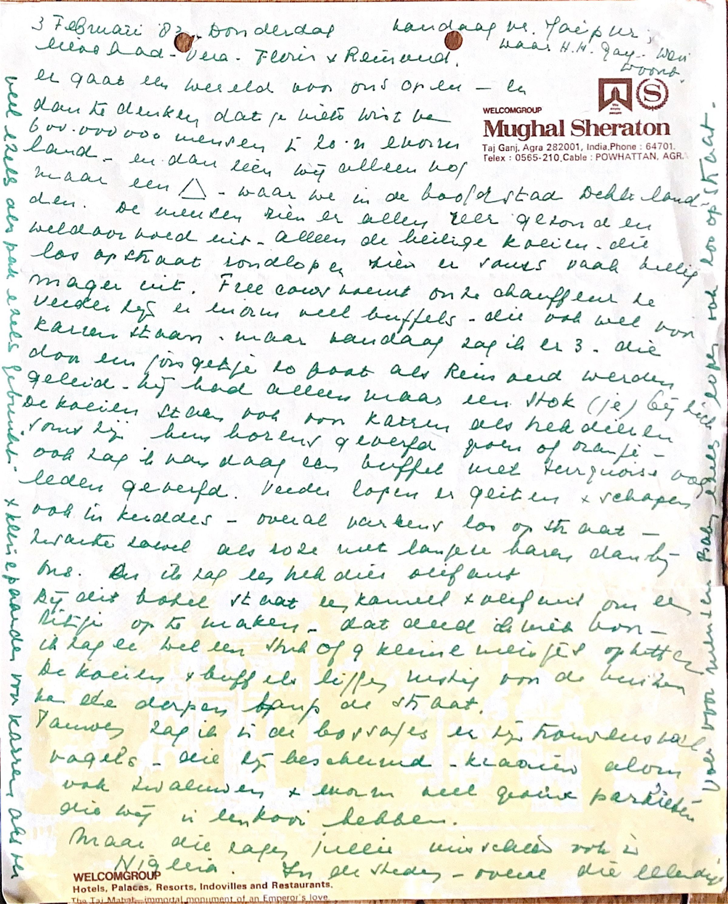 0onderdag 3 februari 1983: Reisverslag van Albertien Dirkzwager-van de Have over verblijf in India vooer Aad, Vera, Floris en Reinoud.