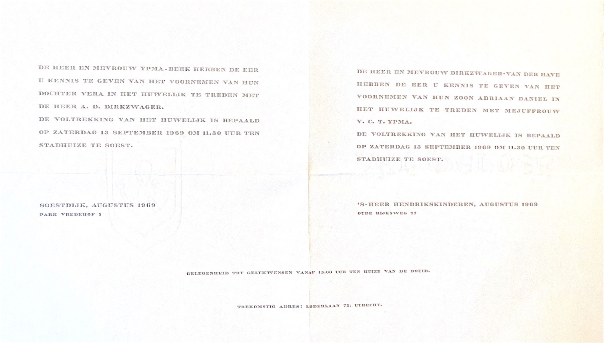 De heer en mevrouw Ypma-Beek hebben de eer u kennis te geven van het voornemen van hun dochter Vera in het huwelijk te treden met de heer A. D. Dirkzwager. De voltrekking van het huwelijk is bepaald op zaterdag 13 september 1969, om 11.30 uur ten stadhuize te Soest. Soestdijk, augustus 1969, Park Vredehof.