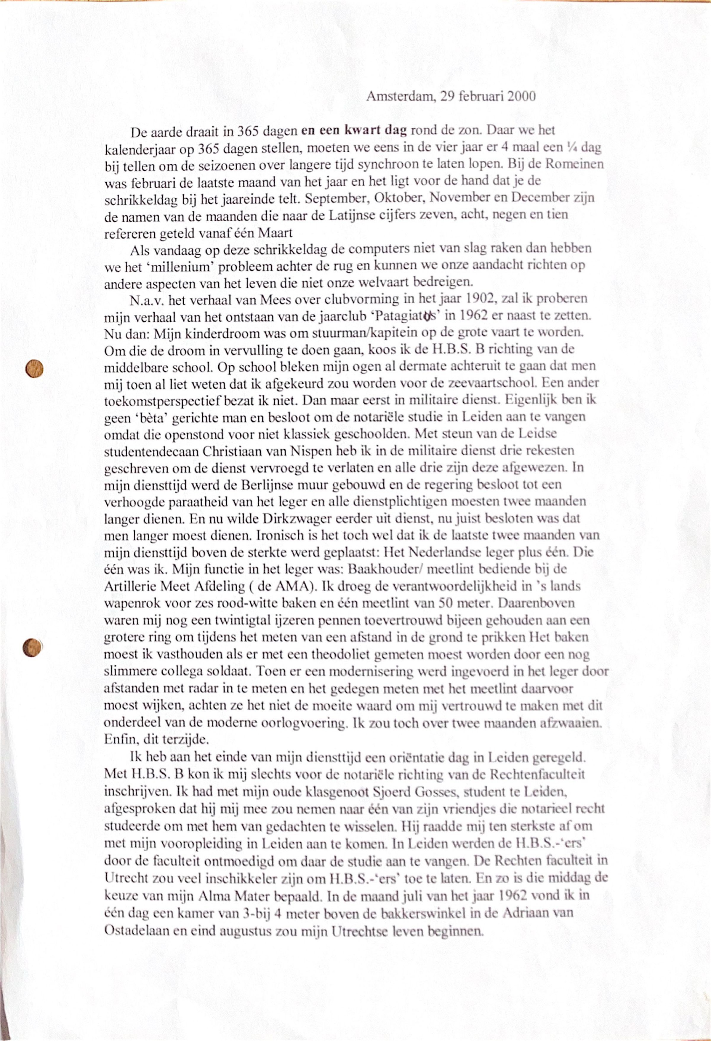 Ik heb aan het einde van mijn diensttijd een oriëntatie dag in Leiden geregeld. Met H.B.S. B kon ik mij slechts voor de notariële richting van de Rechtenfaculteit inschrijven. Ik had met oude klasgenoot Sjoerd Gosses, student te Leiden, afgesproken dat hij mij zou introduceren bij één van zijn vriendjes, die notarieel recht studeerde om met hem van gedachten te wisselen. Hij raadde mij ten sterkste af om met mijn vooropleiding in Leiden aan te komen. In Leiden werden 'H.B.S.-ers' door de faculteit ontmoedigd om daar de studie aan te vangen. De Rechten faculteit in Utrecht zou veel inschikkelijker zijn om 'H.B.S.-ers' toe te laten. En zo is die middag de keuze van mijn Alma Mater bepaald.