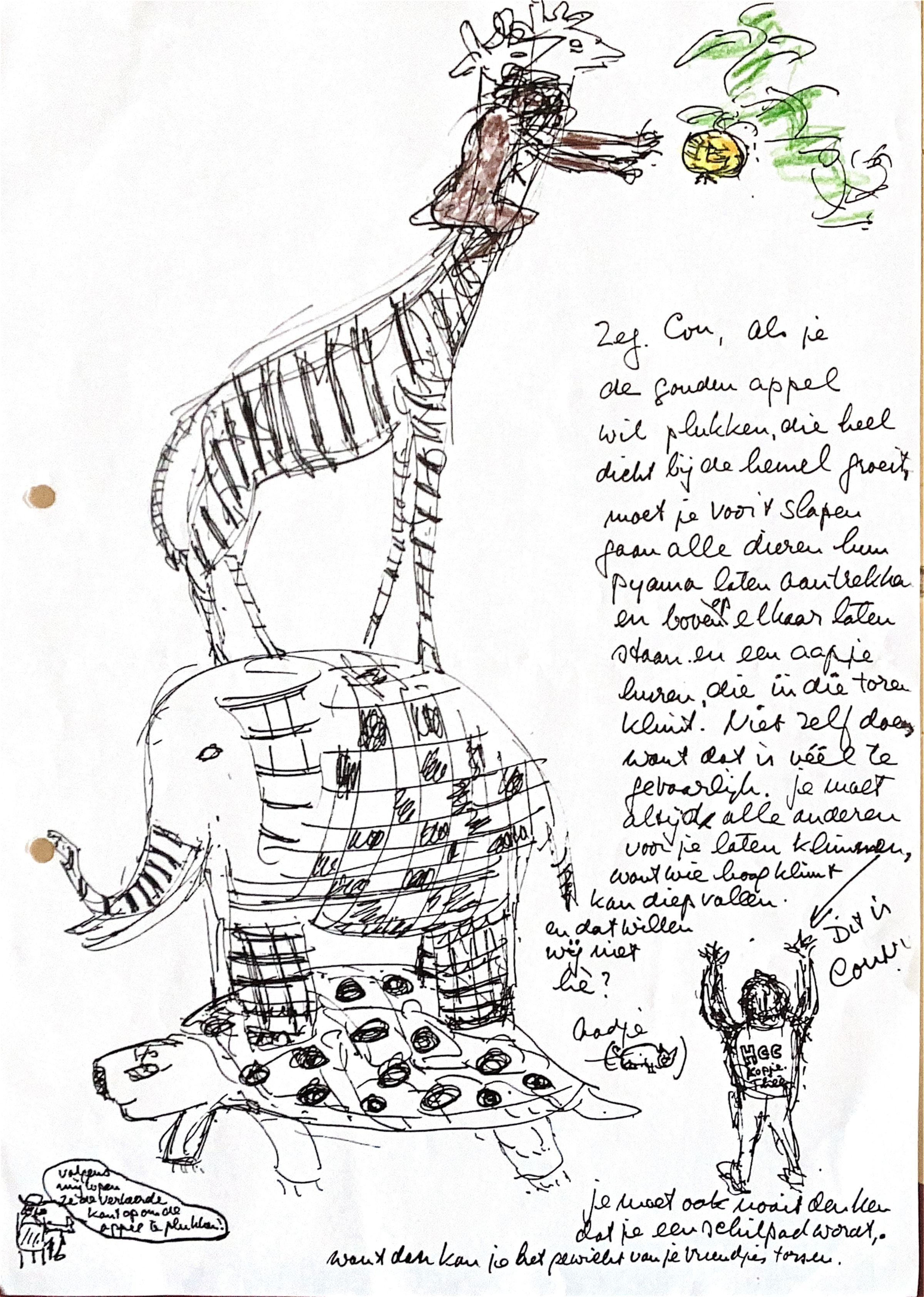 als je de gouden appel wil plukken, die heel dicht bij de hemel groeit, moet je voor het slapen gaan alle dieren hun pyjama laten aantrekken en boven op elkaar laten staan en een aapje huren, die in die toren klimt.