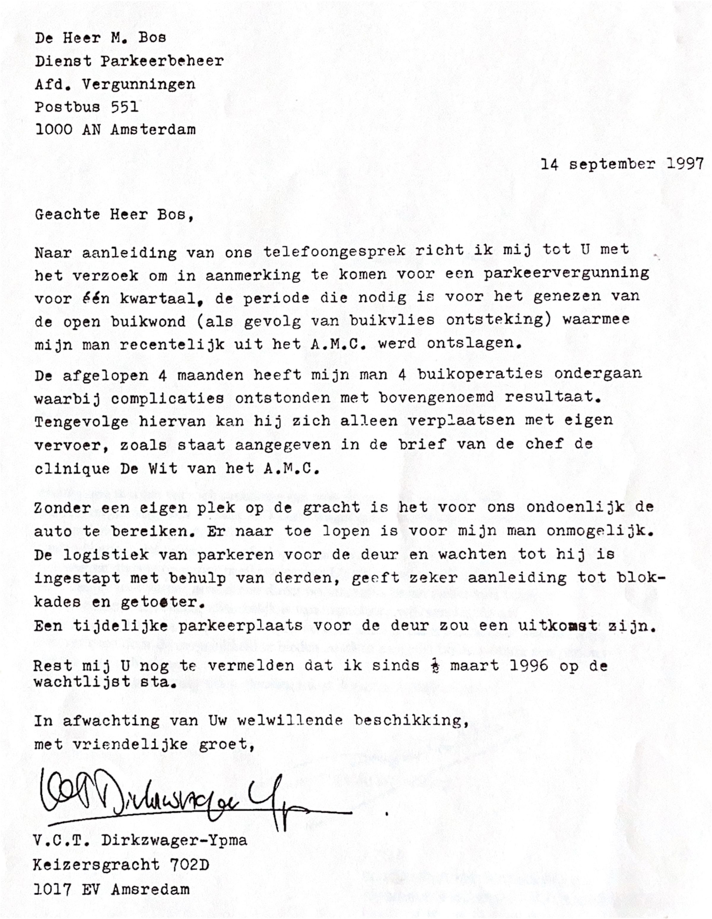 1997-09-14 Aanvraag voor een parkeervergunning n.a.v. operaties in het AMC van ADD.