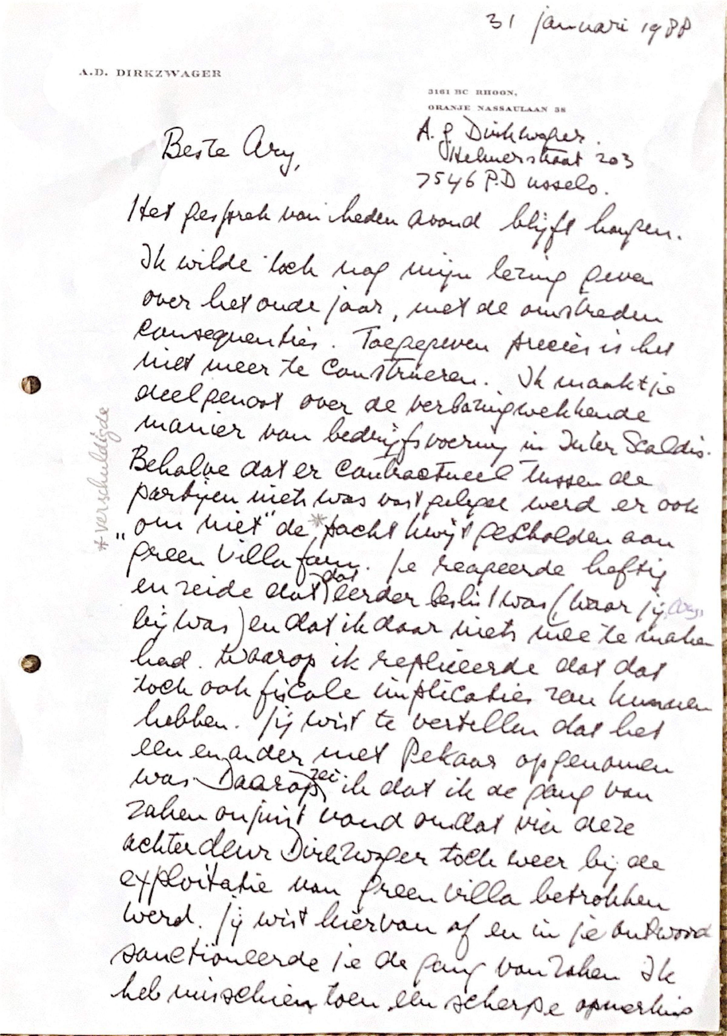 Jij reageerde heftig en zeide dat dat eerder beslist was (waar jij, Ary, bij was) en dat ik daar niets mee te maken had. Waarop ik repliceerde dat dat toch ook fiscale consequenties zou kunnen hebben. Jij wist te vertellen, dat het een ander met Pekaar opgenomen was. Daarop zei ik, dat ik de gang van zaken onjuist vond omdat via deze achterdeur Dirkzwager toch weer bij de exploitatie van Green Villa betrokken werd.