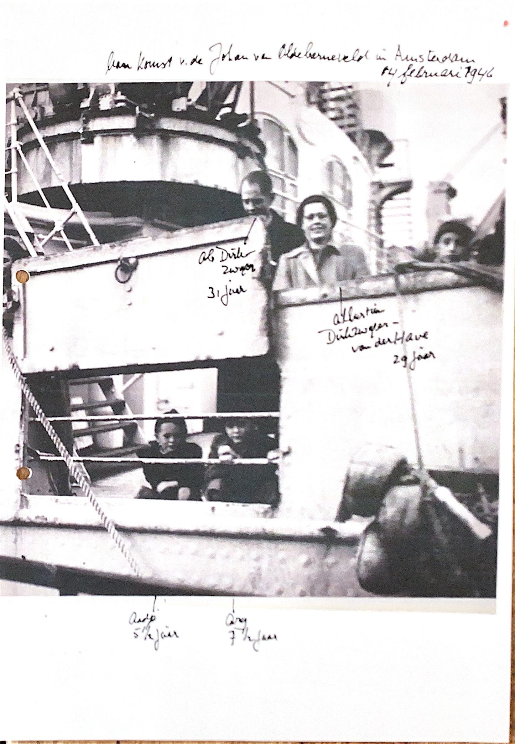 Aankomst johnan v Oldenbarnevelt in haven Amsterdam met Ab & Grootje en 2 zoons