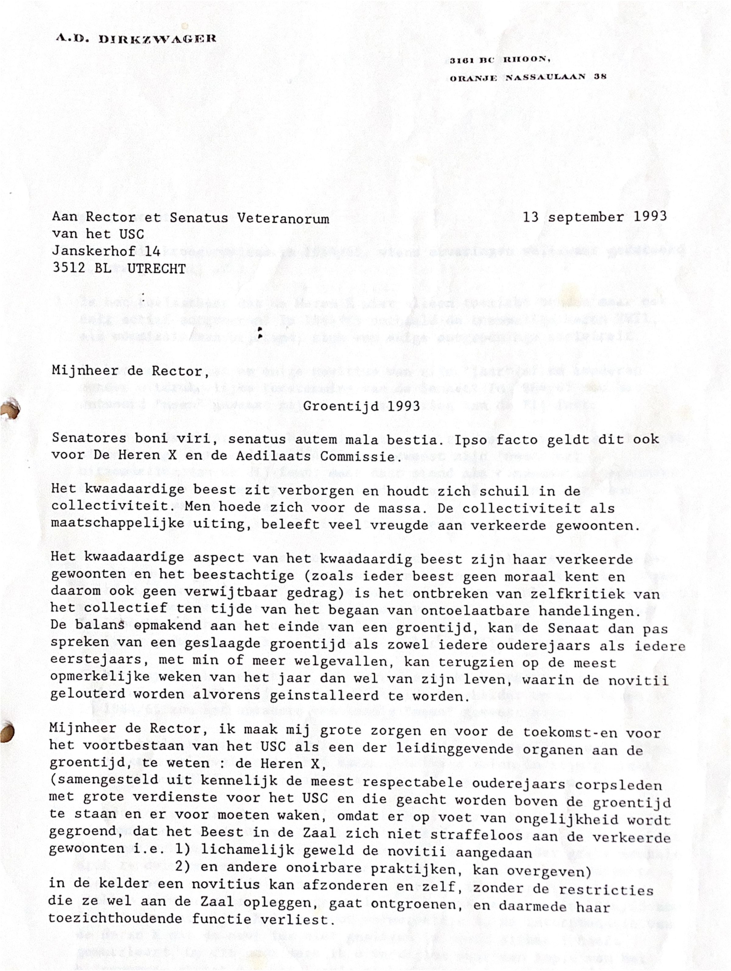 Mijnheer de Rector, ik kan mij niet indenken dat de Heren X met voldoening terugkijken op de nacht van 9 op 10 september 1993, waar het kwaadaardig beest van de "Uebermensch" een ander mens tot een "Untermensch" degradeerde, zijn naam en reputatie defameerde, zonder enig ludiek element (zelfs niet na afloop) en daardoor een strafmaat toepaste, die in een totalitaire systeem niet had mistaan.