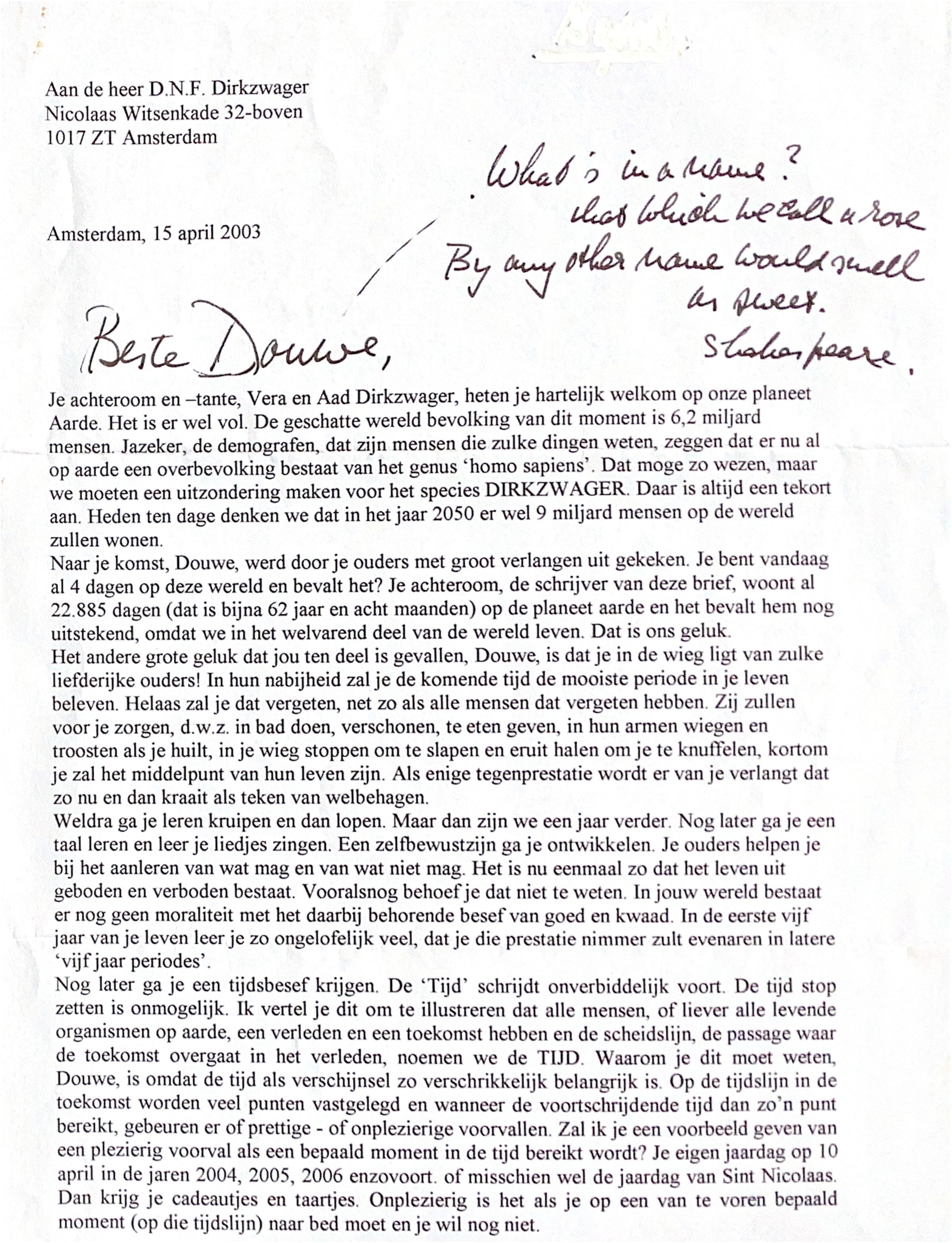 2003-04-15 Brief van Vera & ADD om Douwe Dirkzwager welkom te heten op planeet Aarde.
