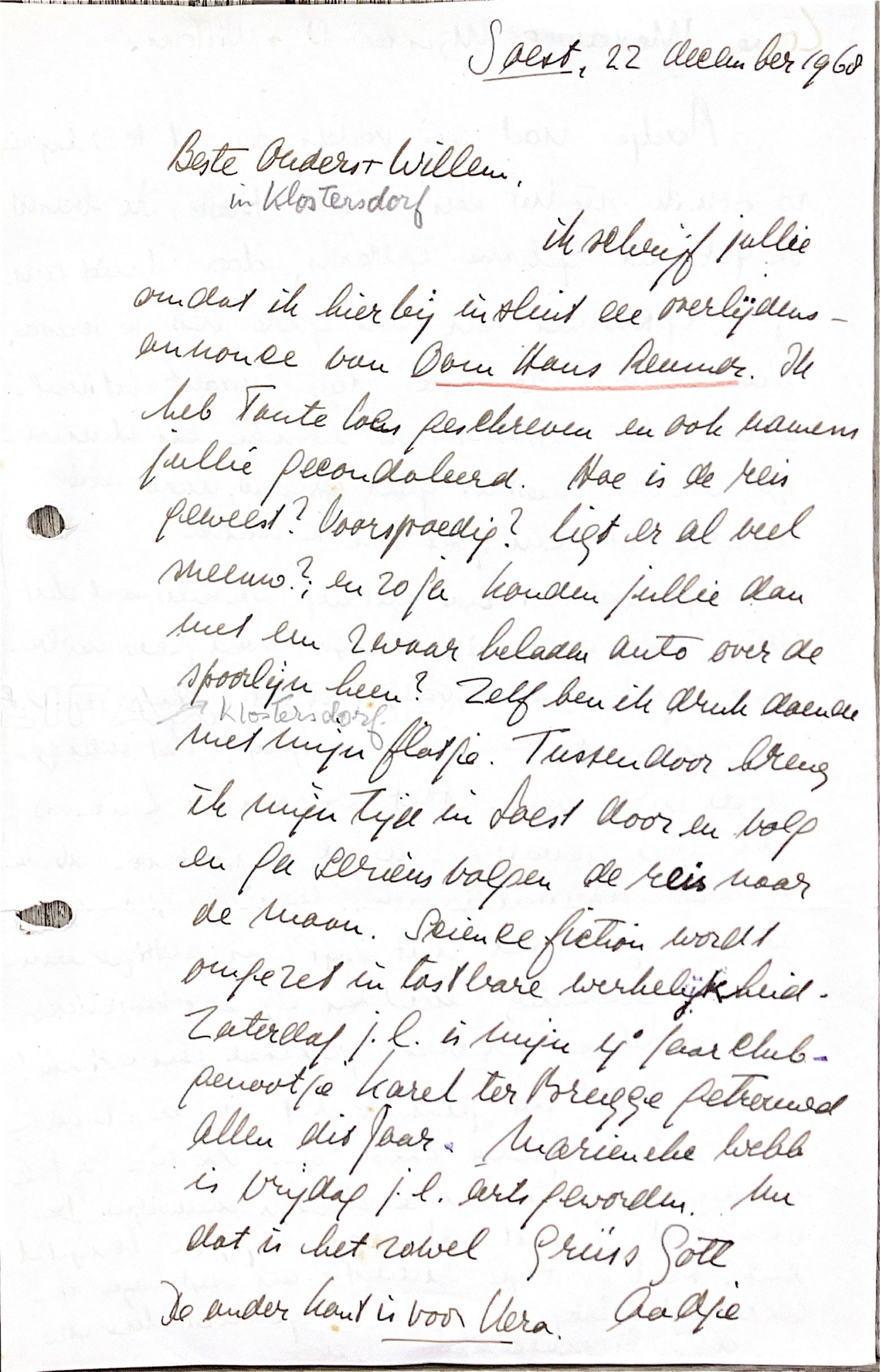 Ik schrijf jullie omdat ik hierbij insluit een overlijdensannonce van Oom Hans Reumer. Ik heb tante Loes geschreven en ook namens jullie gecondoleerd.