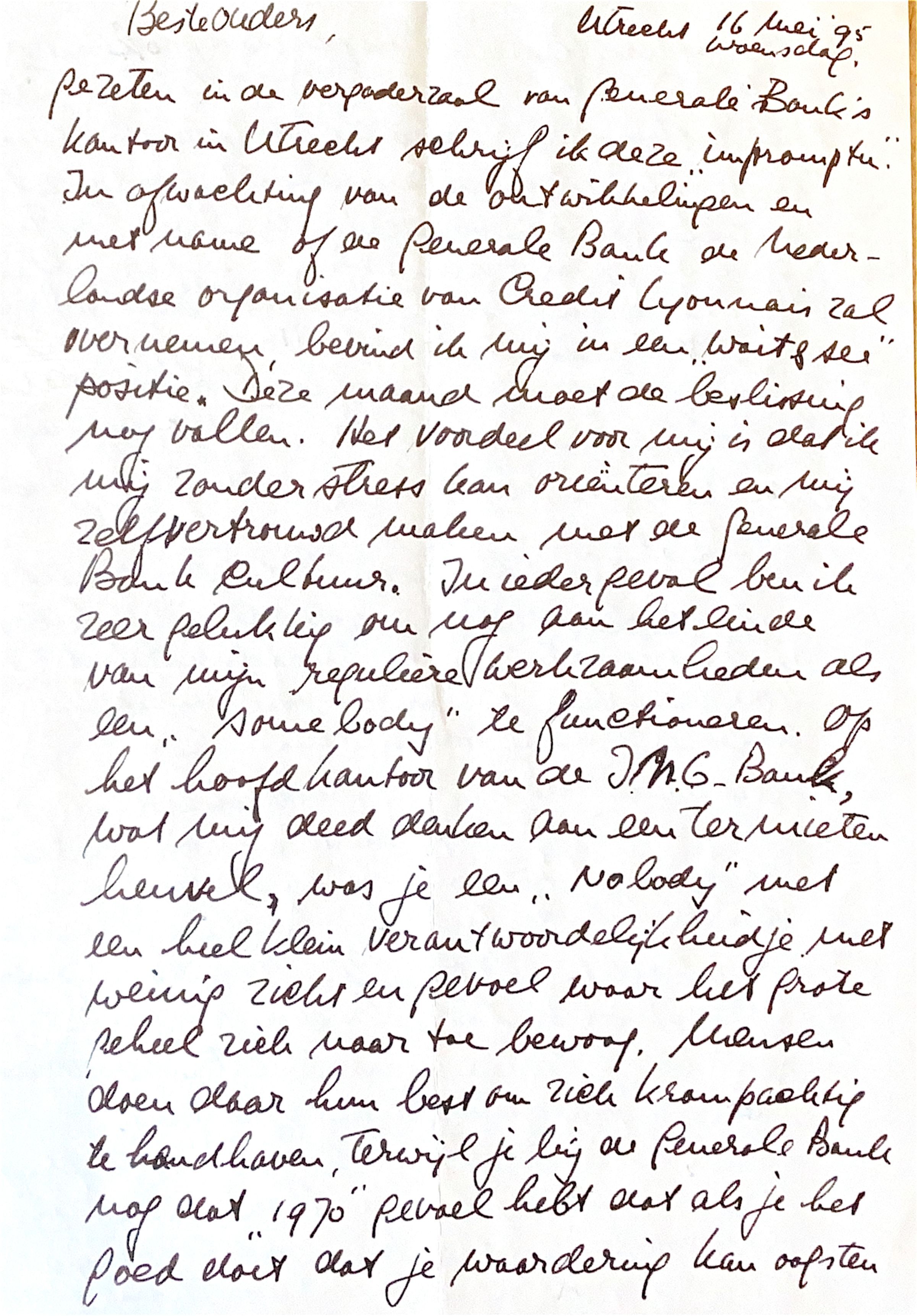 In afwachting van de ontwikkelingen, en met name of de Belgische Generale Bank de Nederlandse organisatie van 'Credit Lyonnais' zal overnemen, bevind ik mij in een "wait & see" positie. Deze maand moet de beslissing nog vallen. Het voordeel voor mij is, dat ik mij zonder stress kan oriënteren en met zelfvertrouwen mij de 'Generale Bank-cultuur' eigen kan maken.