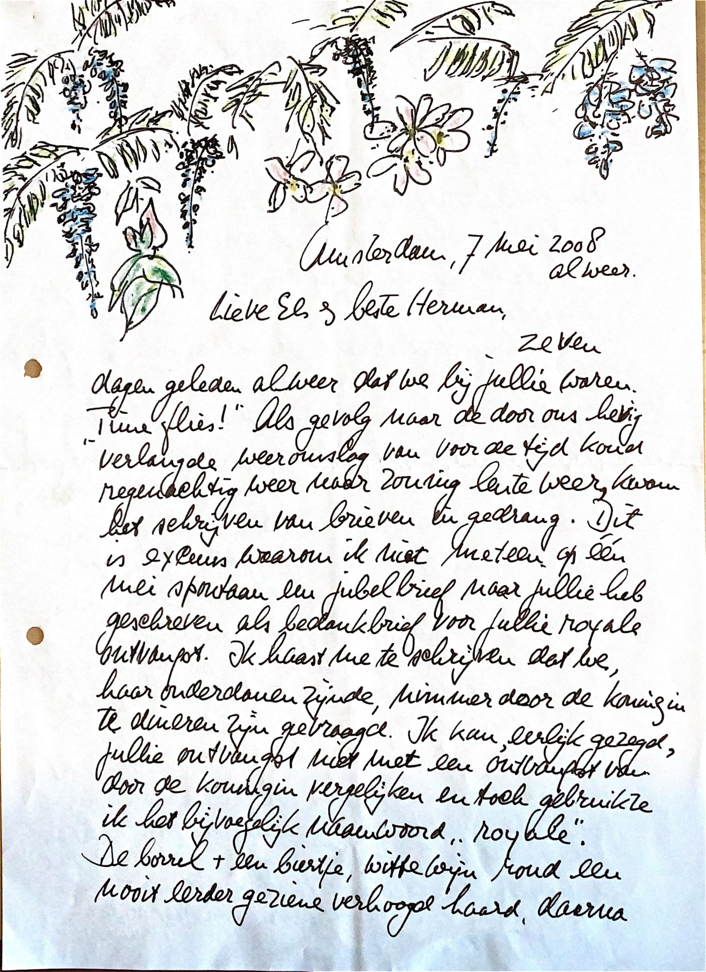 Dit is het excuus, waarom ik niet meteen op één mei spontaan een jubelbrief naar jullie heb geschreven als bedankbrief voor jullie royale ontvangst. Ik haast mij te schrijven dat we, haar onderdanen zijnde, nimmer door de koningin te dineren zijn gevraagd. Ik kan, eerlijk gezegd. jullie ontvangst niet met een ontvangst van de koningin vergelijken en toch gebruikte ik het bijvoeglijke naamwoord:"Royale."