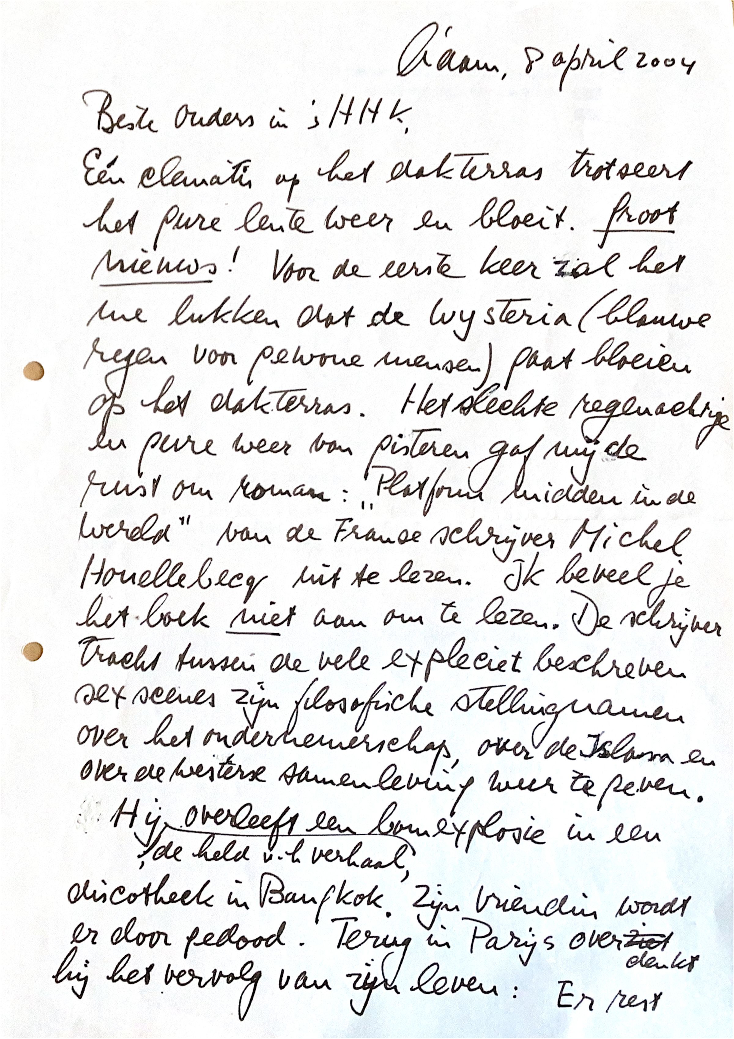 2004-04-08 Brief aan ouders in sHHK met antwoord op mijn brief naar premier Balkenende en een citaat uit het boek -'Platvorm midden in de Wereld' - van Michel Houellebeck.