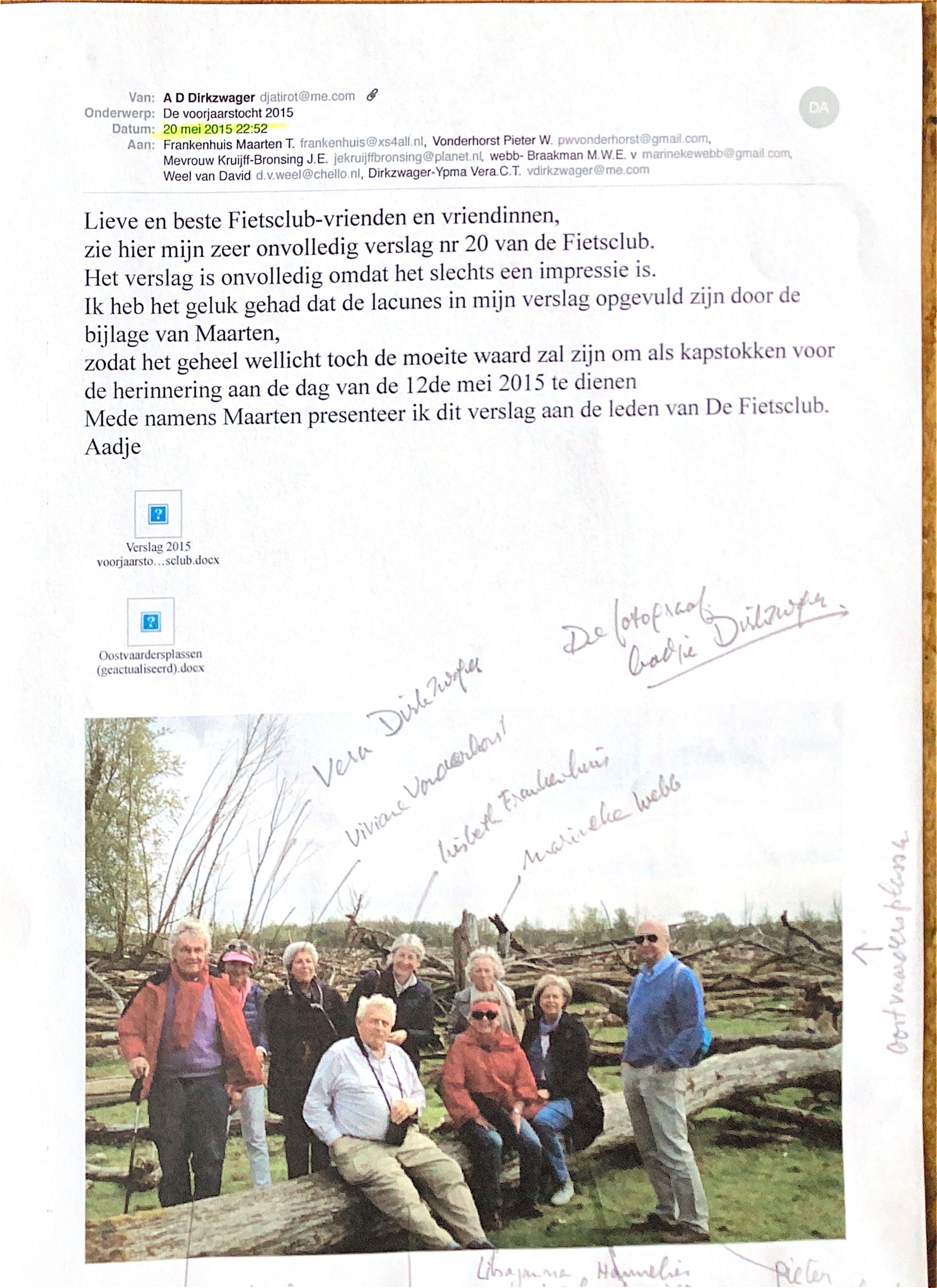 2015-05-20 Mail met de foto v.d. deelnemers aan de voorjaarstocht v.d. De Fietsclub naar de Oostvaardersplassen.