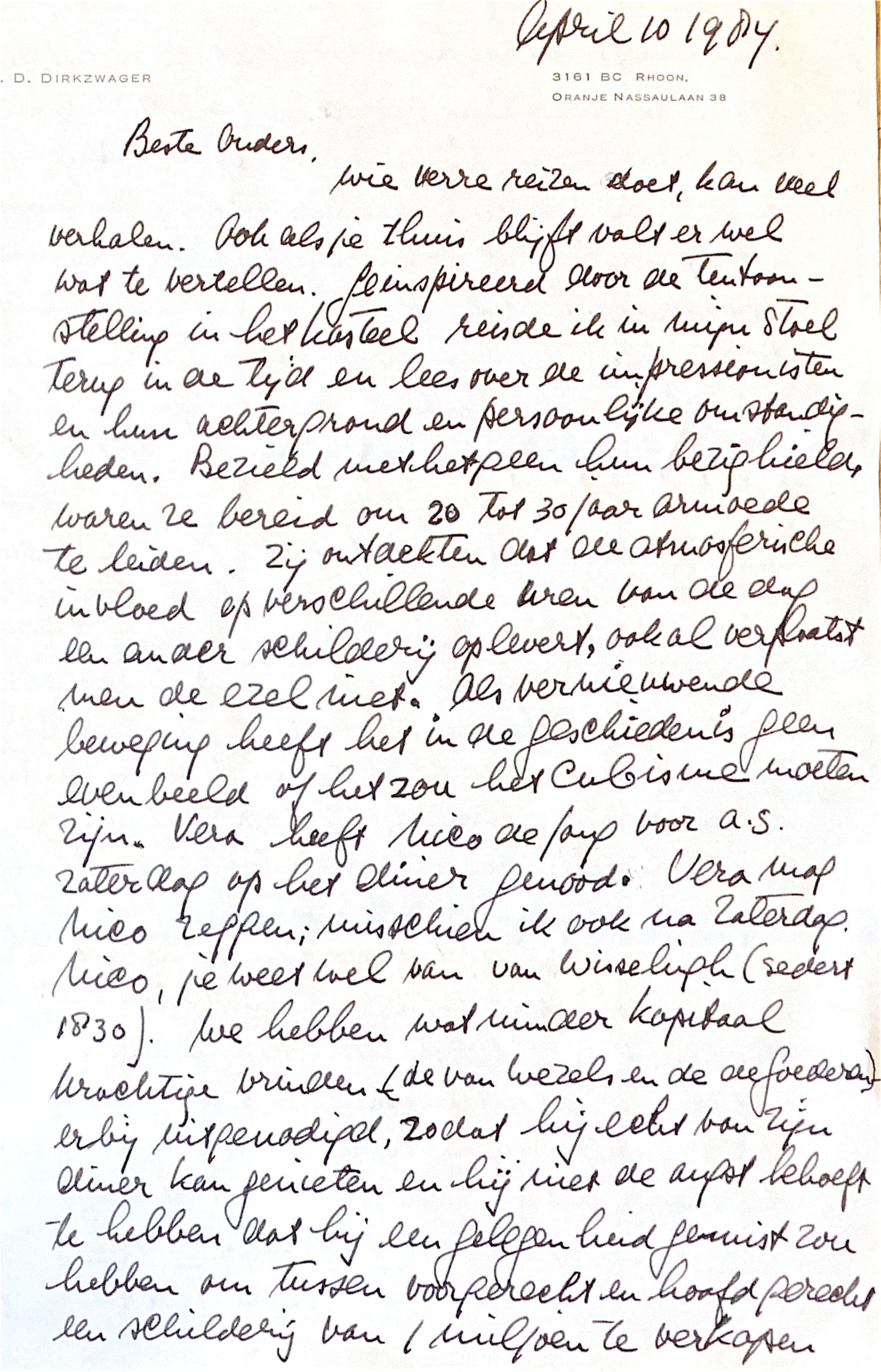 wie verre reizen doet, kan veel verhalen. Ook als je thuis blijft, valt er wel war re vertellen. Geïnspireerd door de tentoonstelling in het Kasteel van Rhoon reisde ik in mijn stoel terug in de tijd en lees over de impressionisten en hun achtergrond en persoonlijke omstandigheden. Bezield met hetgeen hun bezighield. waren zij bereid om 20 à 30 jaar armoe te leiden. Zij ontdekten dat de atmosferische invloed op verschillende uren van de dag een ander schilderij oplevert, ook al verplaatst men de schildersezel niet. Als vernieuwende beweging heeft het in de geschiedenis geen evenbeeld of het zou het "Cubisme" moeten zijn.