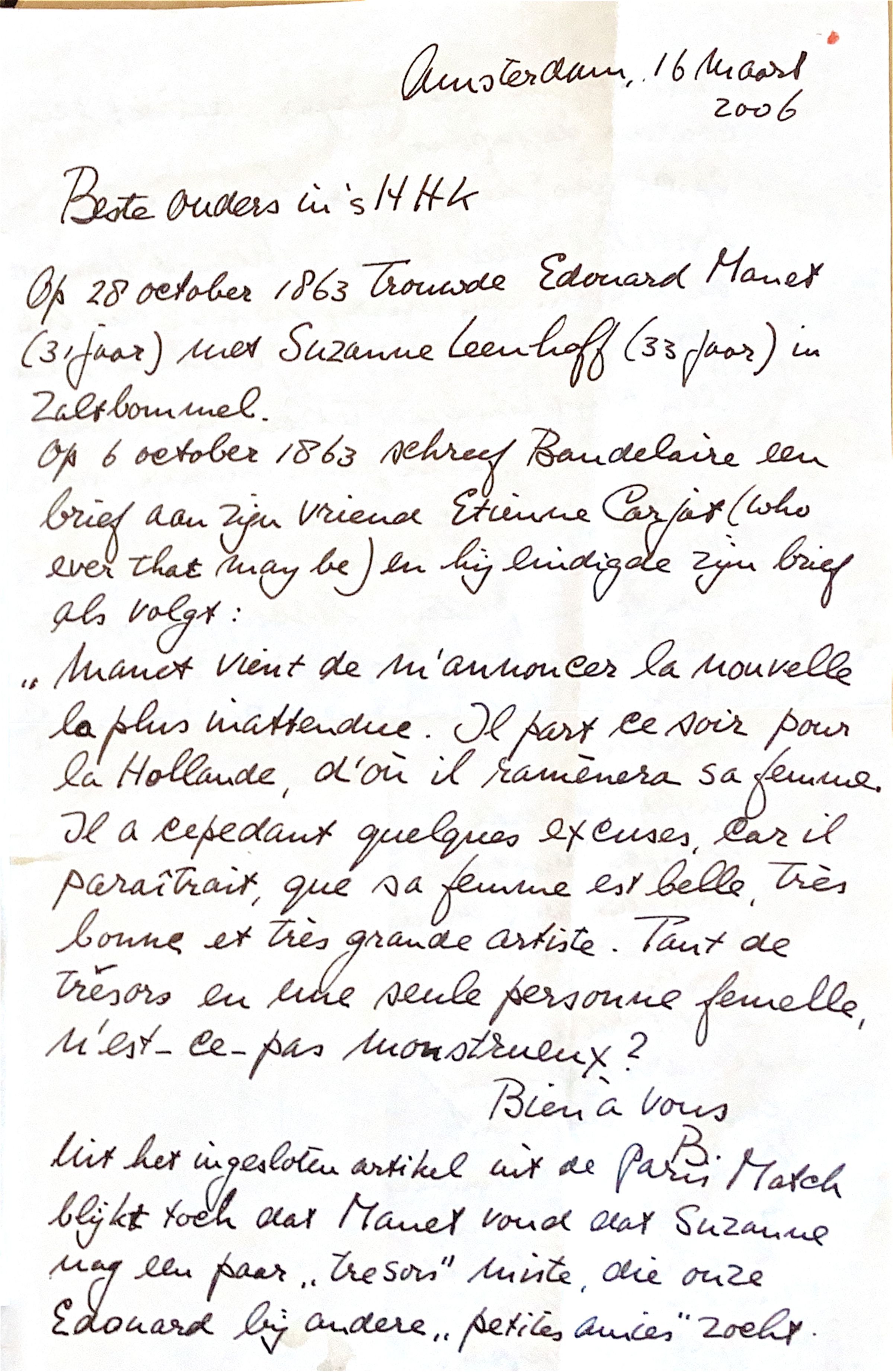 "Manet vient de m'annoncer la nouvelle la plus inattendue. Il part ce soir pour la Hollande, d'où il ramènera sa femme. Il a cepedant quelques excuses, car il paraîtrait, que sa femme est belle, très bonne et très grande artiste.