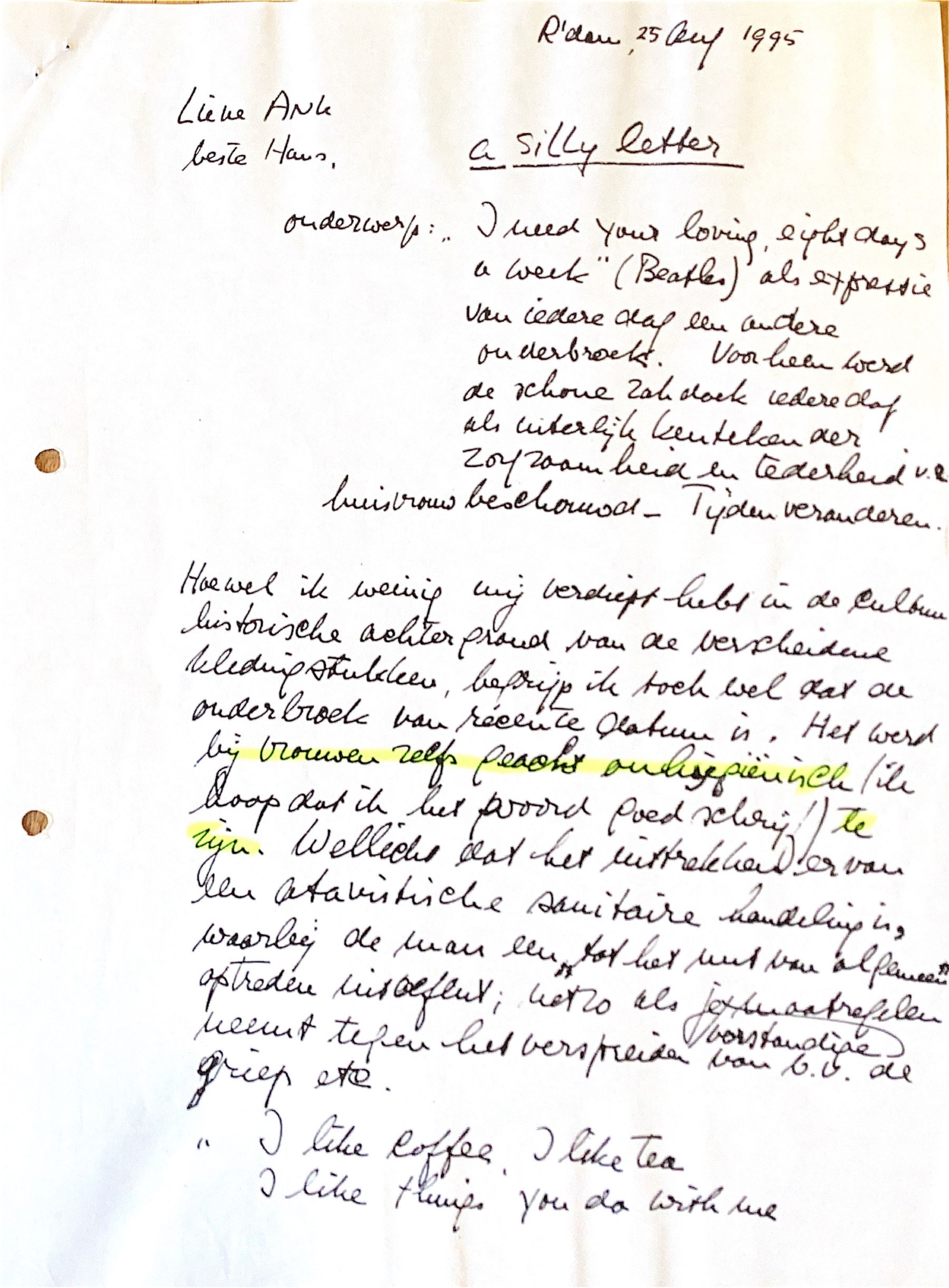 "I need your loving eight days an week" (the Beatles), als een expressie van iedere dag een andere onderbroek, Voorheen werd ieder dag een schone zakdoek als een uiterlijk kenteken der zorgzaamheid en tederheid van de huisvrouw beschouwd, maar "Tijden Veranderen".