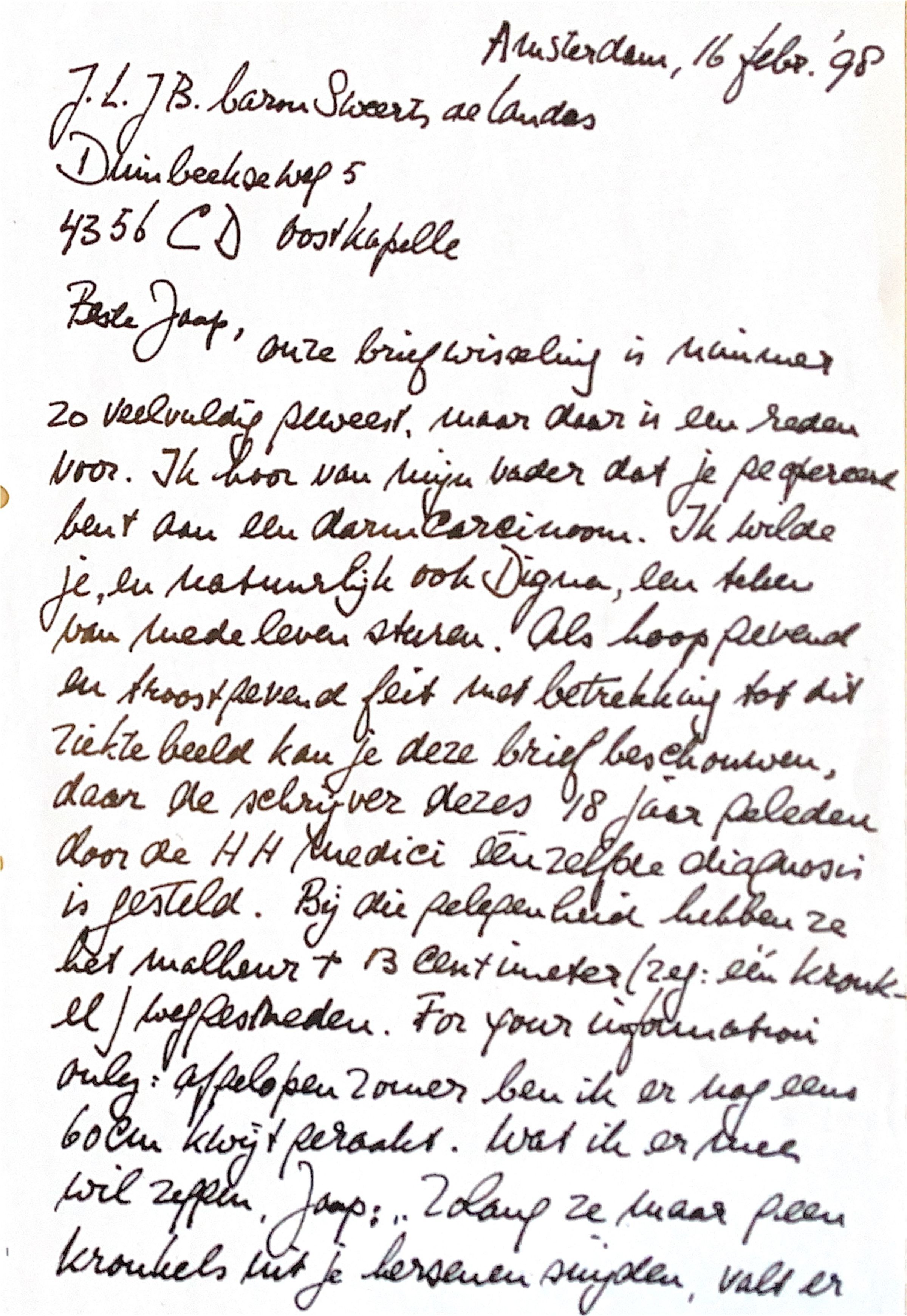 onze briefwisseling is nimmer zo veelvuldig geweest, maar daar is een reden voor. Ik hoorde van mijn vader dat je geopereerd bent aan darmcarcinoom. Ik wilde je, en ook Digna, een teken van medeleven sturen. Als een hoopgevend -en troost-gevend feit, met betrekking tot dit ziektebeeld, kan je deze brief beschouwen, daar de schrijver dezes 18 jaar geleden door de H.H.medici éénzelfde diagnosis is gesteld. Bij die gelegenheid hebben zij het malheur +13 centimeter (zeg:één kronkel) weggesneden. "For your information only" ben ik afgelopen zomer nog eens 60 cm kwijtgeraakt. Wat ik er mee wil zeggen, Jaap: "Zolang ze maar geen kronkels uit je hersenen snijden, valt er mee te leven. Uit eigen ervaring puttend, had ik er baat bij om zo nu en dan een gedicht te lezen. Marsman (je weet wel die van: "Groots en meeslepend wil ik leven" en " Het roer kan nog zes maal om") schreef een bijzonder gedicht dat mij als operatie-patient aansprak. Misschien ken je het.gedicht.