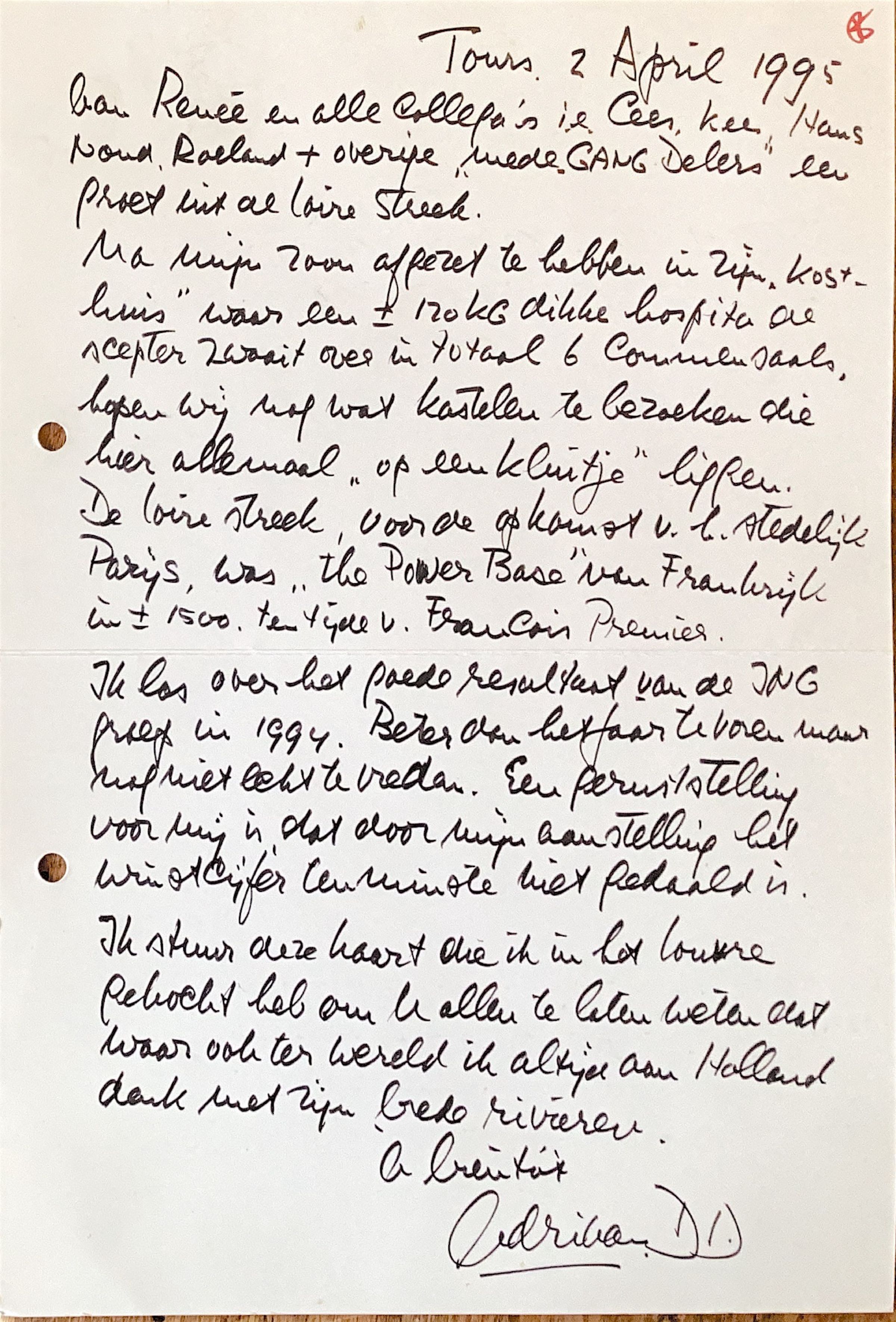 Ik stuur deze kaart, die ik in het Louvre-museum gekocht heb om u allen te laten weten, dat waar ook ter wereld ik ben, altijd aanHolland denk met zijn brede rivieren.