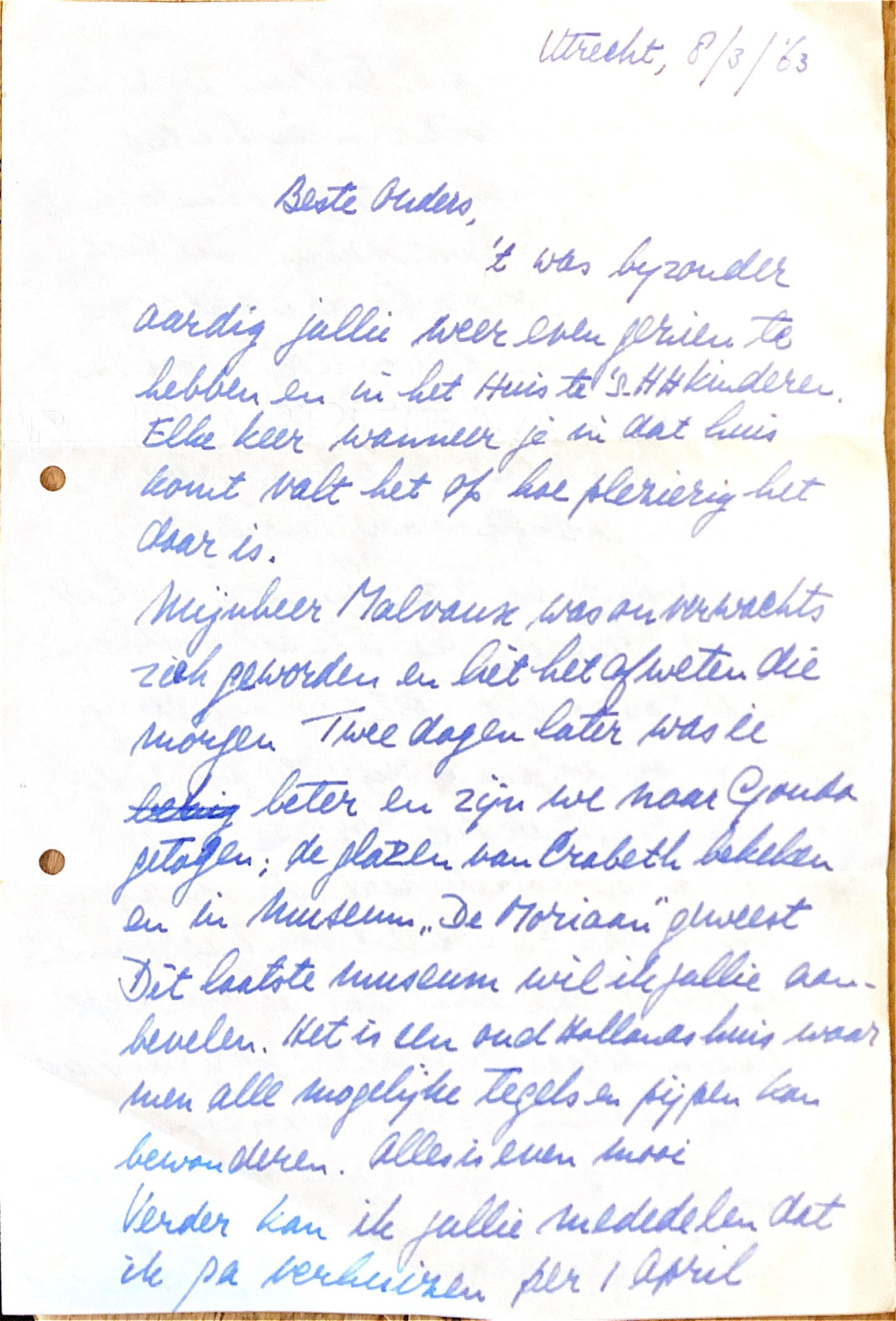 Mijnheer Malvaux was onverwachts ziek geworden en liet het afweten die morgen. Twee dagen later was ie beter en zijn we naar Gouda getogen,. Daar hebben we de glazen van Crabeth (in de kerk) bekeken en in Museum "De Moriaan" geweest. Dit museum wil jullie aanbevelen. Het is een oud Hollands huis waar men alle mogelijke tegels en pijpen kan bewonderen. Alles is even mooi. Verder kan ik jullie mededelen dat ik ga verhuizen per 1 april naar een huis met telefoon, warm en koud stromend water en een douche. Ik ga samen wonen op één kamer met Rogier van Nieuwenhuizen. Dat met zijn tweeën op één kamer is niet zo'n bezwaar, want hij woont ook bij zijn ouders in Utrecht en zit voor 60% thuis.Oj a, waar het is? Op de Oude Gracht.